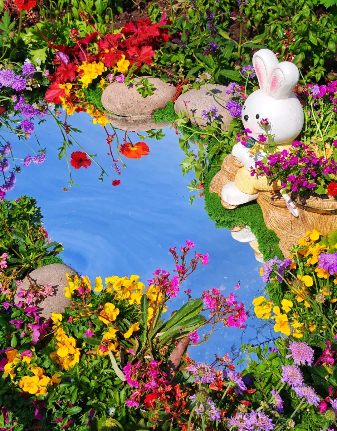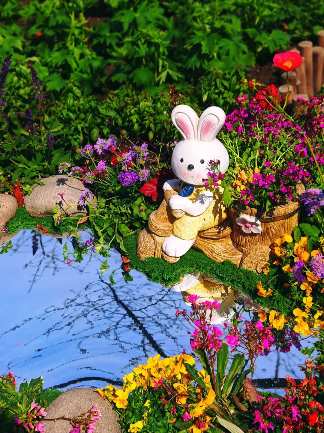 可爱的兔子摆件静卧于花境之中