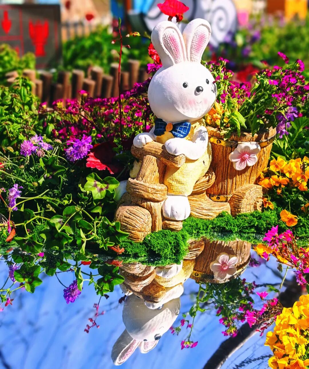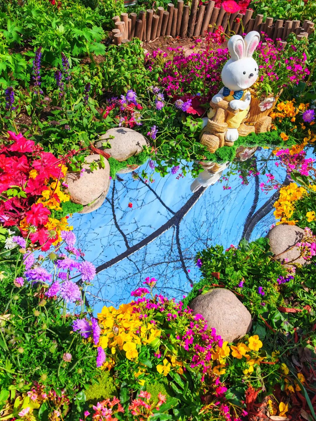 形成“花映天、兔伴景”的诗意画面