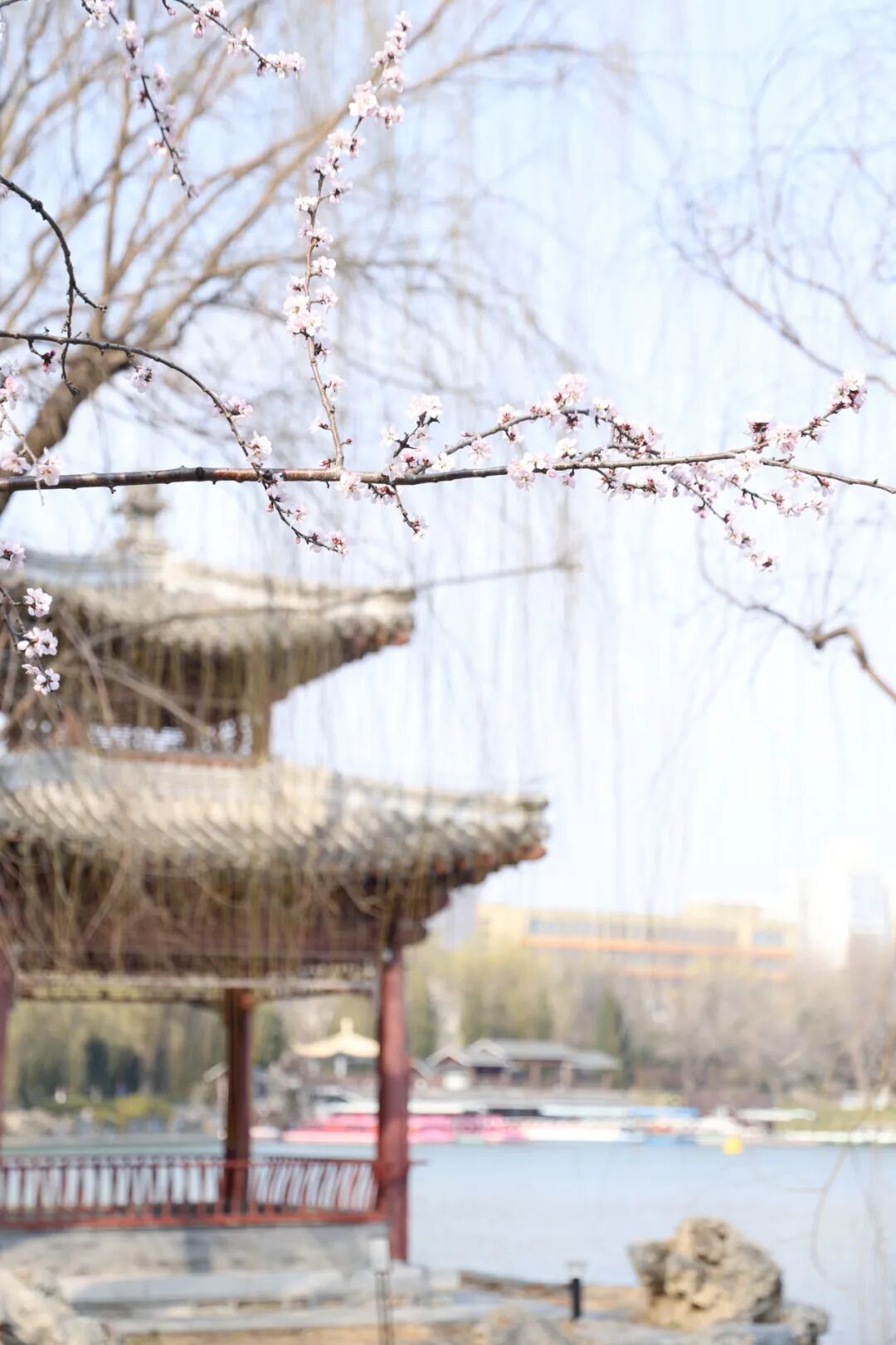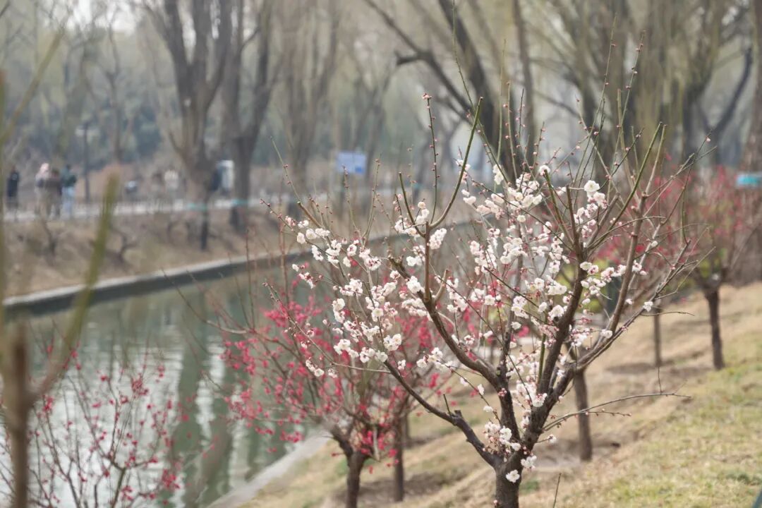 公园结合竹、梅、松造景,在竹、松边,在建筑、山石、小溪旁,在长河沿岸,片植着清幽的梅花,花开时徜徉其中,嗅着梅花的阵阵芳香,惬意极了。