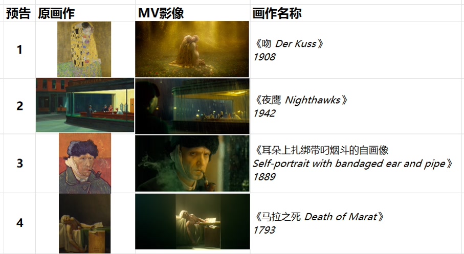 周杰伦专辑正式推出之前,每天都有一支预告上线,都与世界名画有关。第一支预告画面是致敬1908年的《吻》;第二支预告画面致敬1942年的《夜鹰》,MV中周杰伦还和梵高在酒吧里对话;第三支预告画面致敬1889年梵高《耳朵上扎绑带叼烟斗的自画像》;第四支预告,则致敬了1793年的《马拉之死》。名画通过现代影像的技术重现生命力,一幅幅名画都栩栩如生,跃然于MV之中。