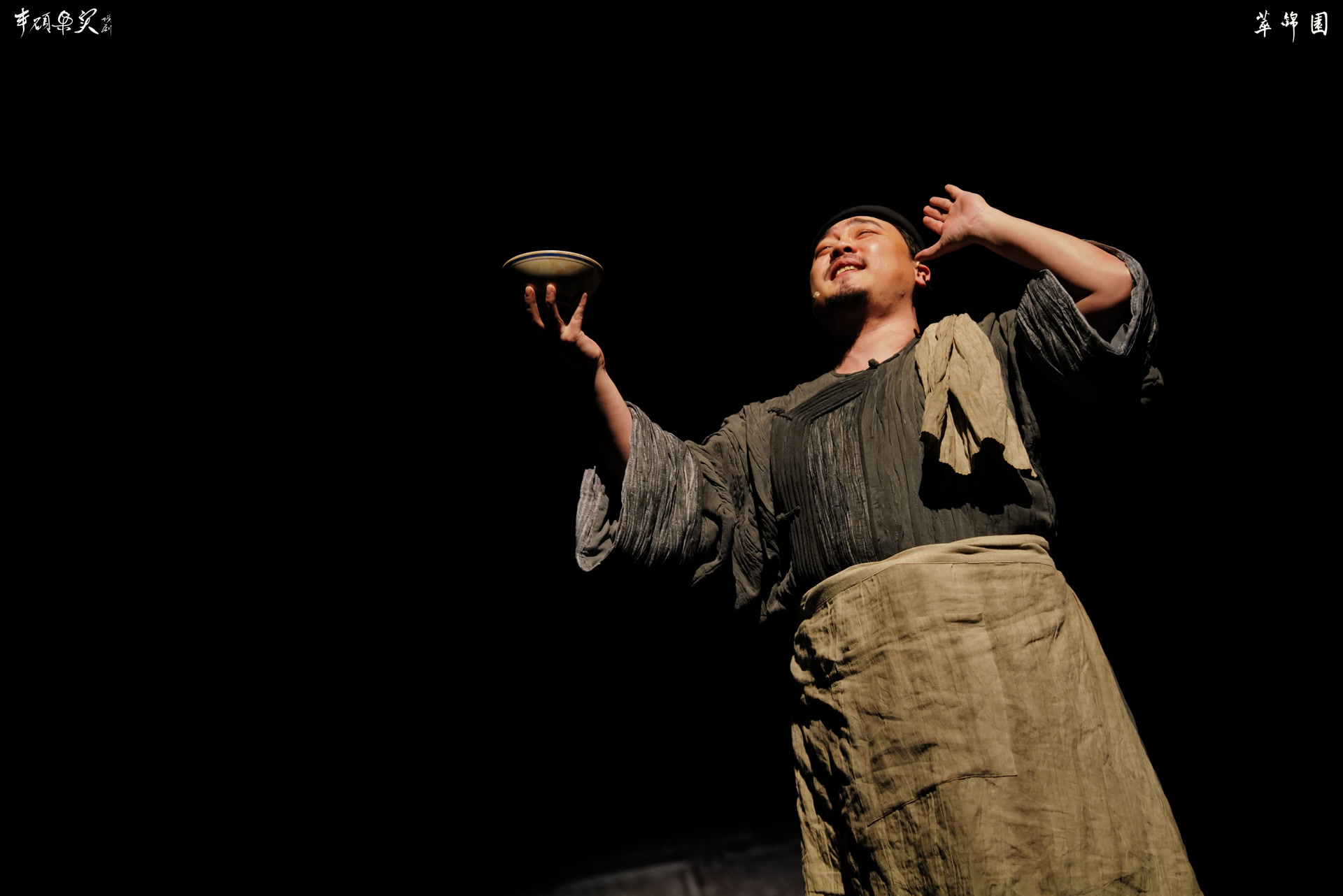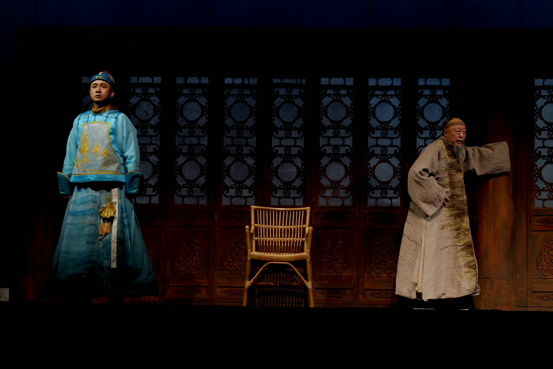 舞台一角,金鹏、徐洋、穆德莹三位演奏家组成现场乐队,以埙、箫、大鼓、三弦等传统国乐入戏,为这段历史谱写出一曲沉郁顿挫的弦外之音。埙声起,苍茫悠远,瞬间将人拉入那个风雨飘摇的年代;箫声咽,幽咽低回,契合光绪独坐时的孤绝与不甘;大鼓擂,声沉力厚,有如时代巨轮碾过心头的闷响,每一记都叩击人心;三弦铮铮,弹拨出市井烟火气息……演出结尾,一段大鼓的独奏由沉郁渐转昂扬,竟生出几分当代的韵律,引来满堂喝彩。
