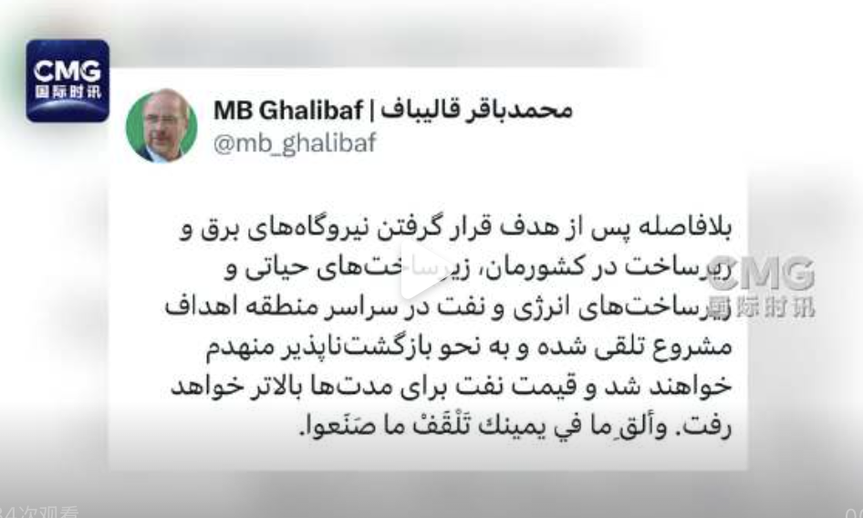 伊朗议会议长卡利巴夫今天(3月22日)在社交媒体发文称,一旦伊朗的发电厂、能源和石油设施等关键基础设施遭到攻击,那么整个地区的此类目标都将被视为合法目标,并将遭到不可逆转的摧毁。