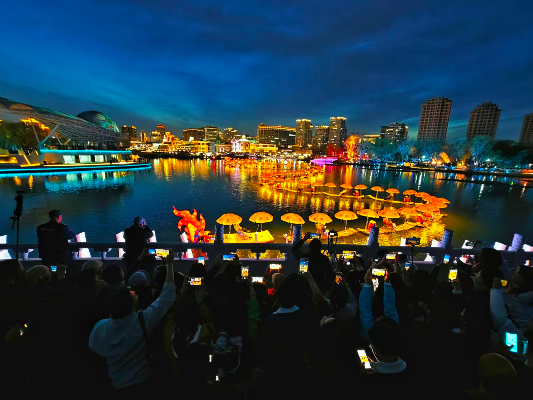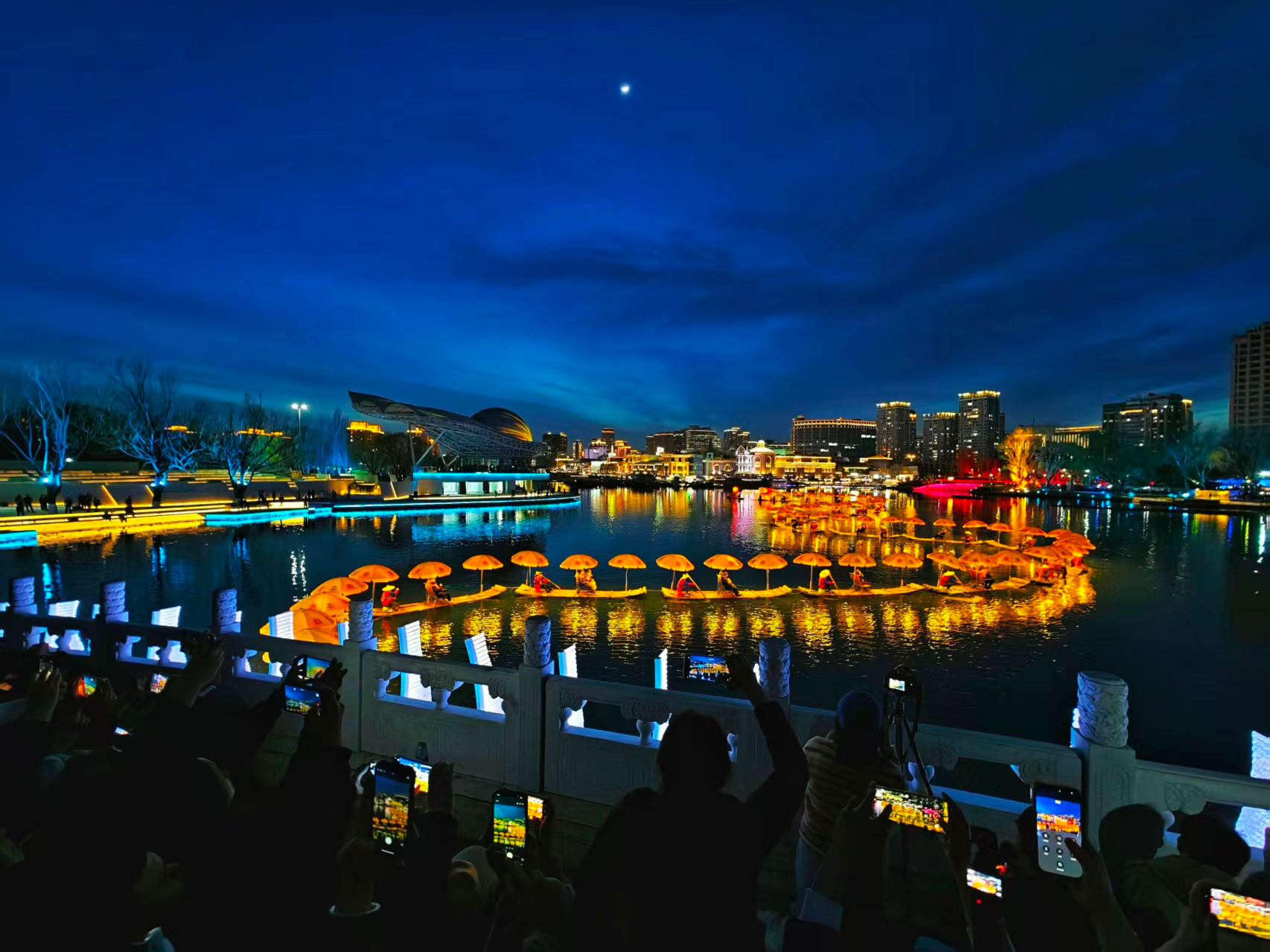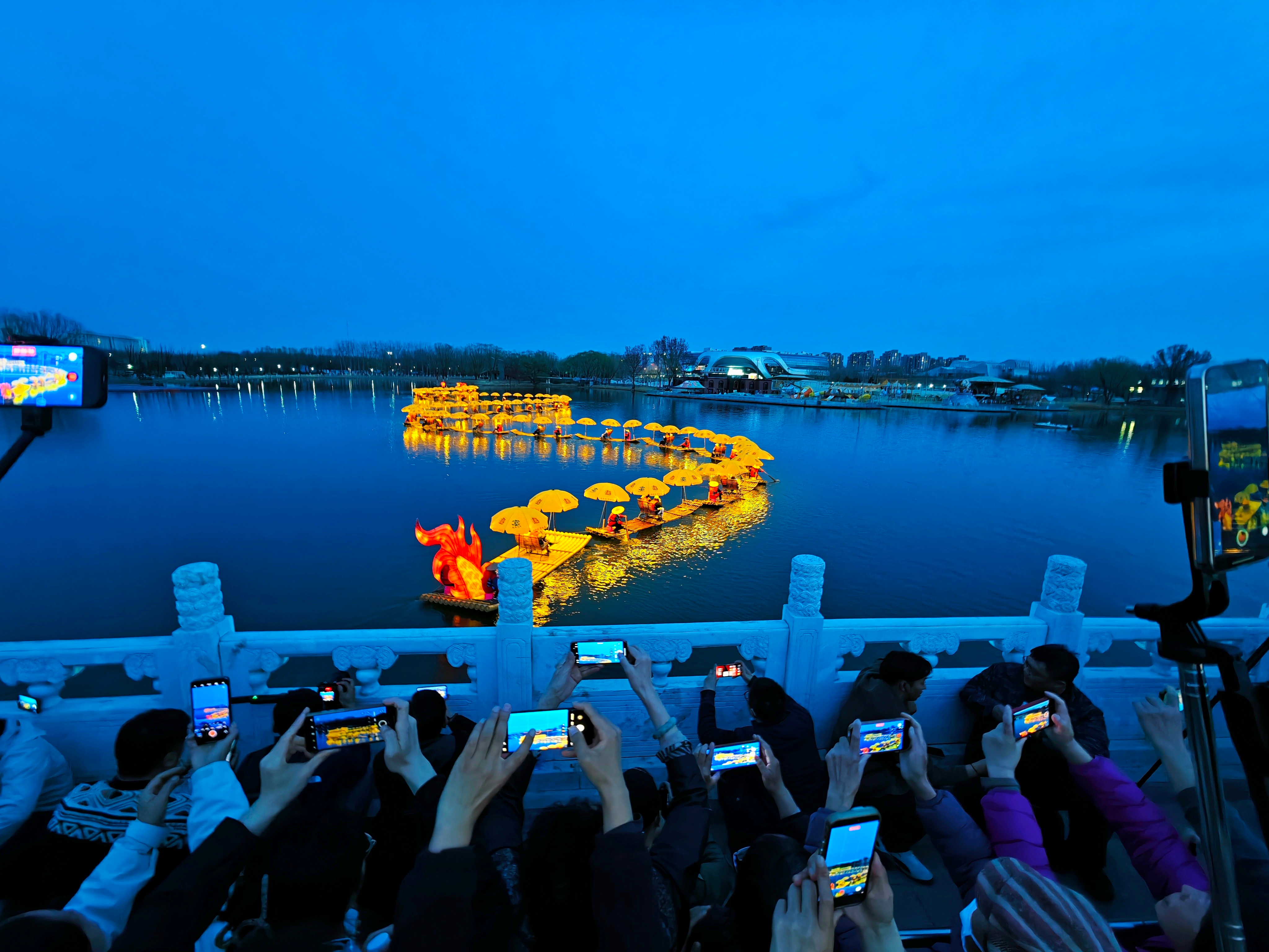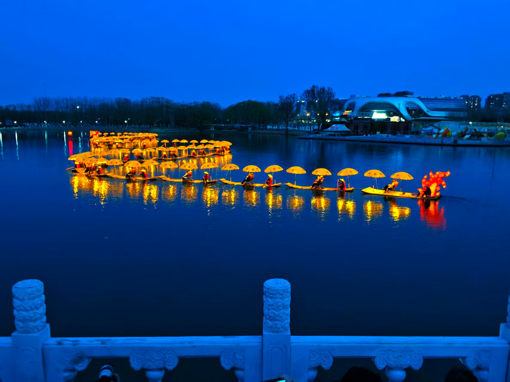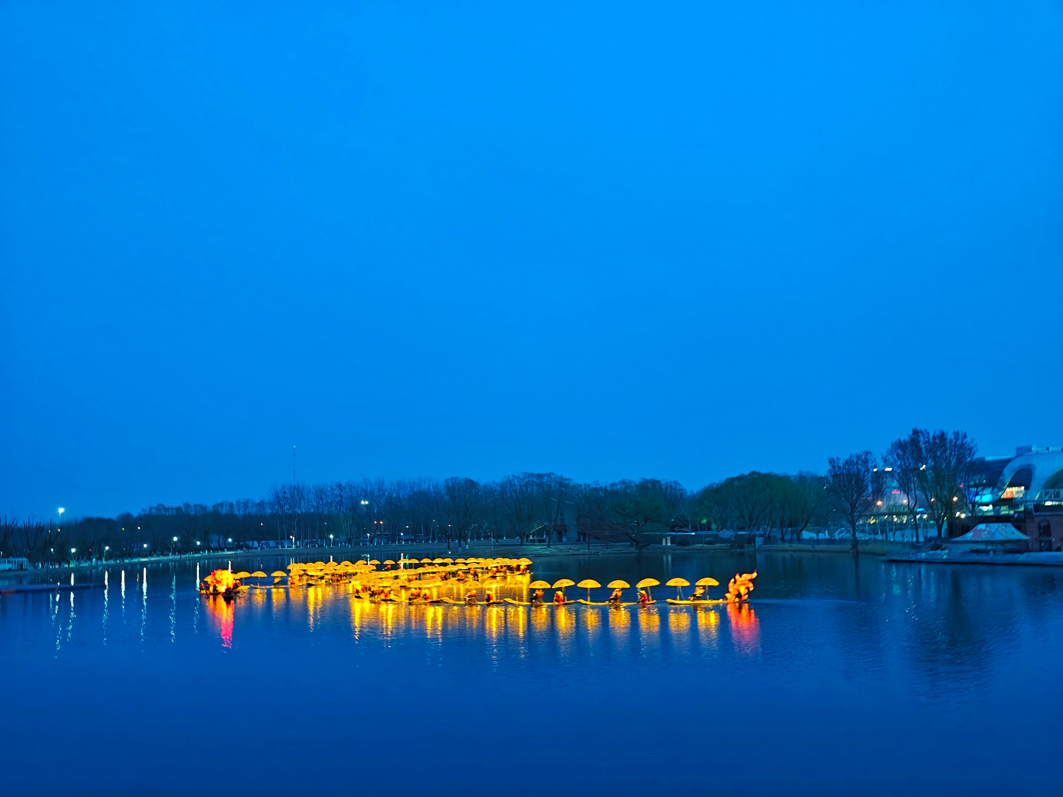 北京亮马河上,竹筏串联的“金龙”流光溢彩