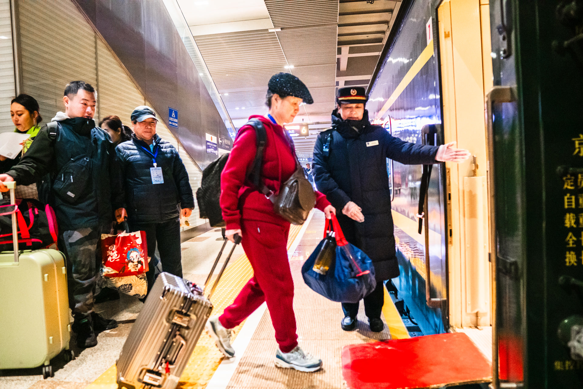 列车老年人较多,北京小汤山医院2名医护人员全程随行,并配备了血压仪、血糖仪、心电监护仪等医疗设备,携带了充足的急救药品与常用口服药。列车工作人员配合中铁旅集团带队导游和随行医生,为有需要的老人测量血压、血糖。乘务组则提供热水、餐食预订、垃圾清理等服务,提前做到站提醒,还按照平日3倍的数量领取贴身卧具,途中及时更换,让旅客乘车更舒适。