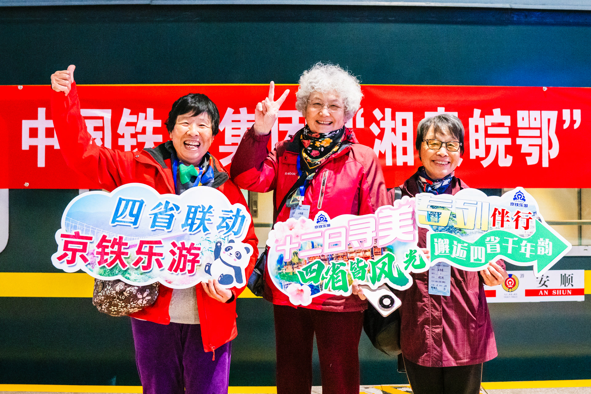 列车还未出发,车厢便充满了欢声笑语。本趟专列以“畅游多彩中国·体验文化交融”为主题,全程12天,串联起安徽、湖南、贵州、湖北四省旅游资源,行程覆盖6个国家5A级景区与8个国家4A级景区。游客们将有机会登临雄奇险峻的天柱山,探秘被誉为“亚洲第一大瀑布”的黄果树大瀑布,走进气势磅礴的马岭河峡谷,徜徉于峰林如画的万峰林,感受三国古战场赤壁的历史余温,亦可漫步于凤凰古城、寻访芷江受降纪念馆,在旅途中沉浸式体验侗族、布依族风情及明代屯堡文化等非遗魅力,专列还在贵州段设计了A、B两条特色定制线路。