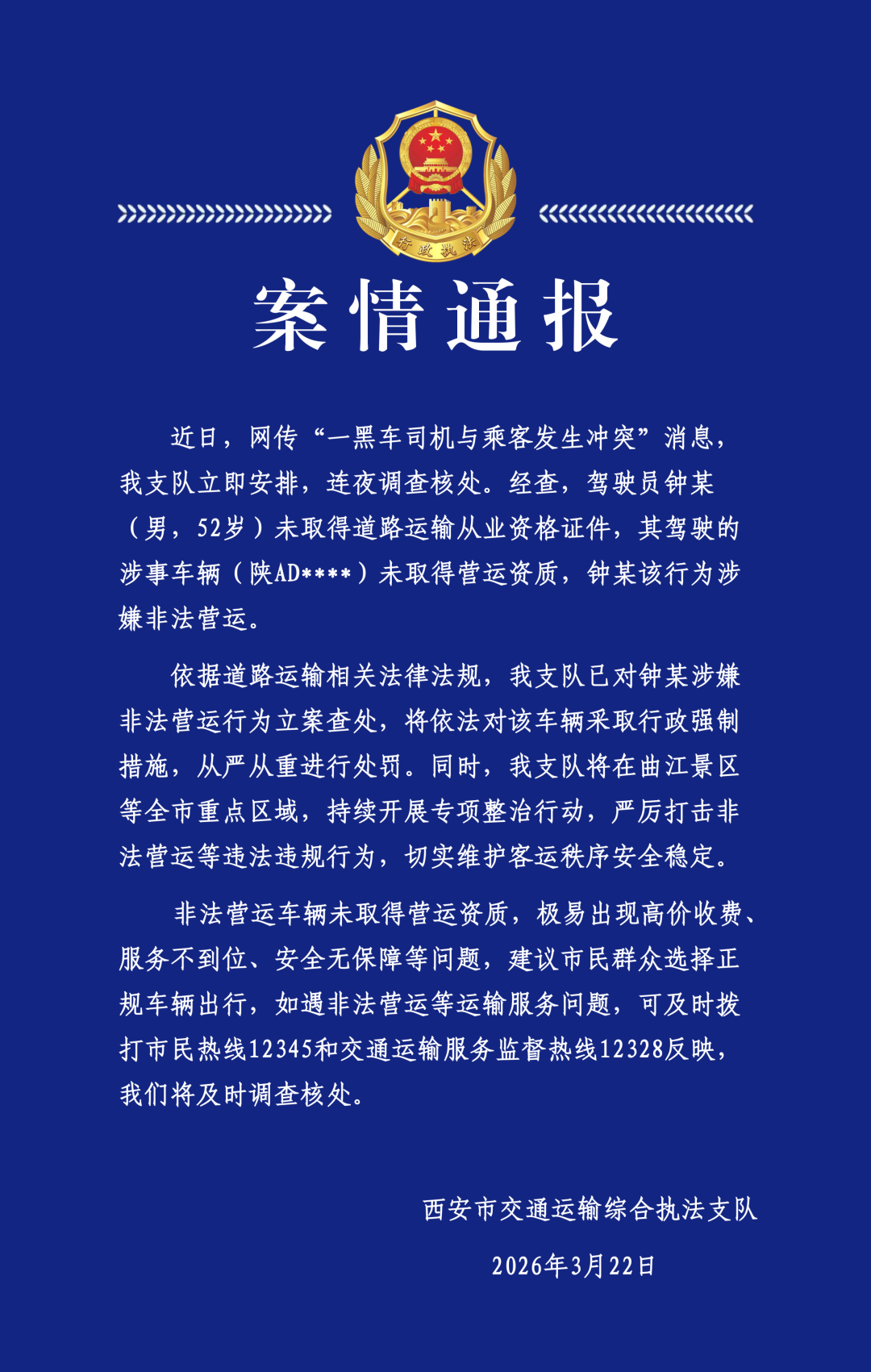 3月22日,西安市公安局雁塔分局发布警情通报称,针对近日网传“非法营运车辆司机与乘客发生冲突”一事,该局当日已受案调查。