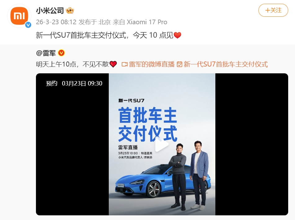 据小米公司官微消息,新一代SU7首批车主交付仪式,今天上午10点举行。