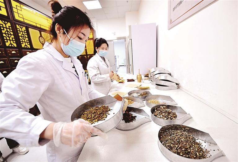 在河北深州市中西医结合医院“共享中药房”,工作人员在调配中药。新华社发