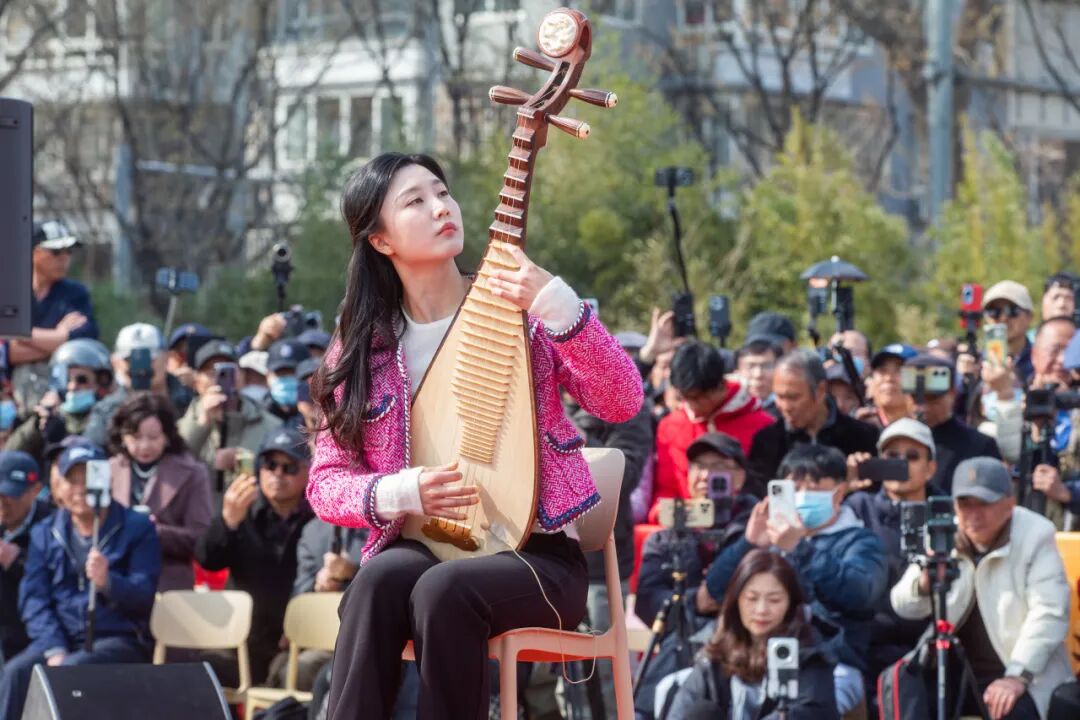 青年竹笛演奏家孙楚泊作为本场演出的焦点人物,其表现尤为亮眼。她与中央民族歌舞团民乐团团长马兰花老师合作演奏的《白马》等乐曲将现场推向了高潮,曲目专为本次演出排练,融合了竹笛与阮的调式创新和速度变化,展现了艺术家的默契与匠心。孙楚泊在演出后接受采访时难掩兴奋:“这是2026年开春第一场户外专场,2025年结尾时,我也在天桥市民文化广场演出,跨过一年,公益演出接连开演。”她坦言,露天演奏初时紧张,但随着观众的热情升温,逐渐找到了“户外感觉”。孙楚泊说,曲目选择注重专业性与流行性平衡,既有红歌如《山丹丹开花红艳艳》的合奏,引发全场大合唱,也有《我爱你中国》的独奏,唤起爱国情怀。“我选曲时,没有刻意强调‘春天’这个季节,而是以欢快为主,突出乐器的技术特性与当下节气契合。希望让大家感受到民族音乐的多元精彩,近距离体会每件乐器的独特魅力。”