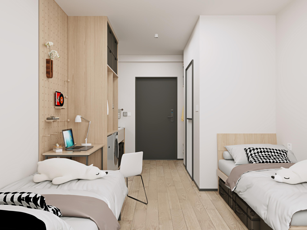 其中,35平方米主力户型设计灵活多元,配备阳台、飘窗、平窗等多种窗型,可根据需求设置为单人间或双人间,满足基础居住需求。室内配套独立集成卫生间、书桌、衣柜,空调、洗衣机等家电一应俱全,墙面采用环保耐擦洗涂料,宜居便捷、易于打理。
