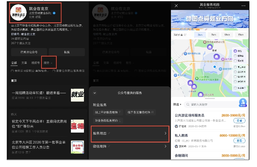 在“就业在北京”微信公众号的菜单栏,点击“服务地图”也可以找到“首都公共就业服务地图”,系统会根据用户定位自动推送3公里、5公里、10公里和15公里范围内的服务资讯,更能一键进行岗位查询、简历投递、活动报名及职业指导预约,实现了“打开地图,即享服务”。
