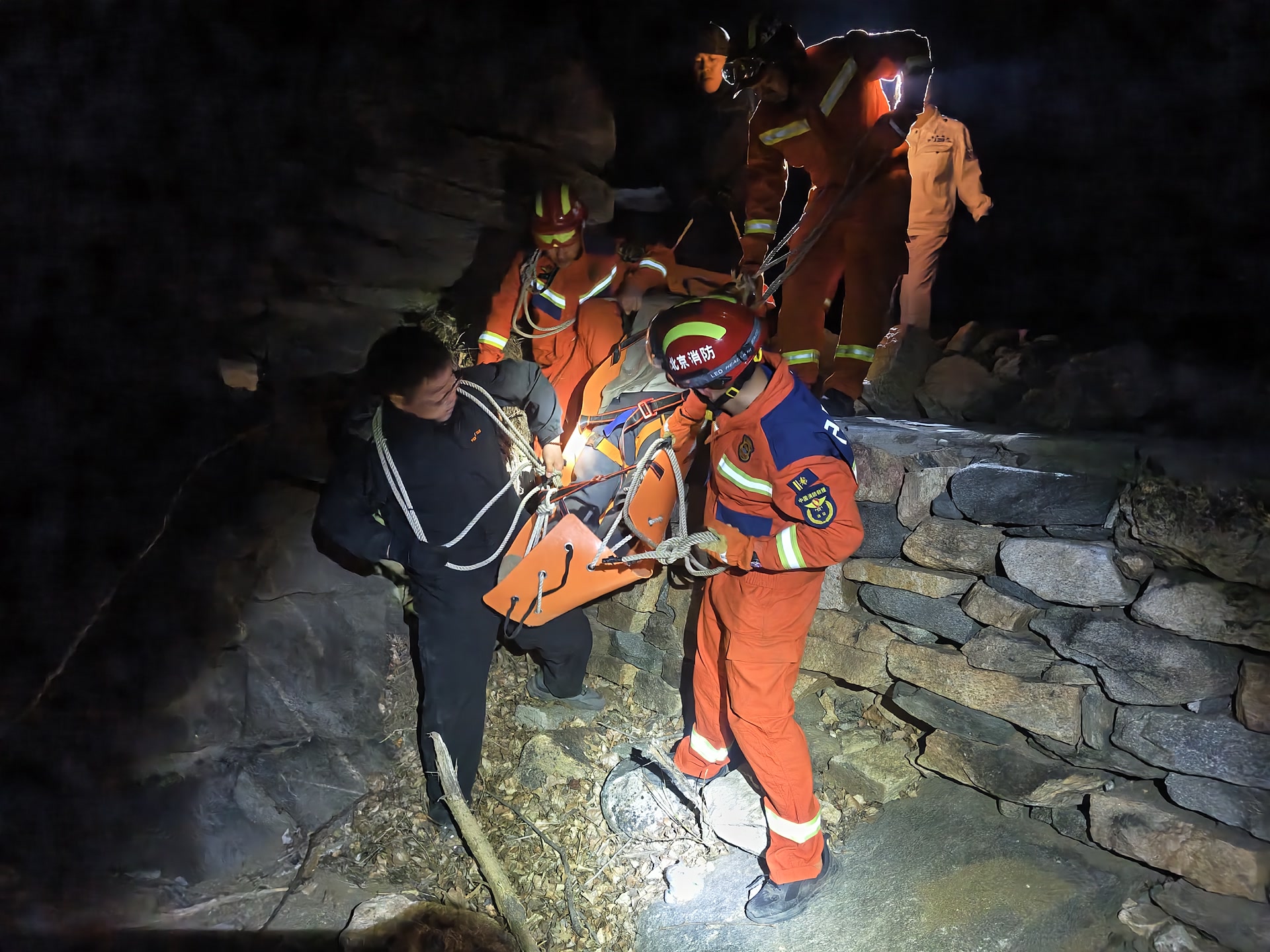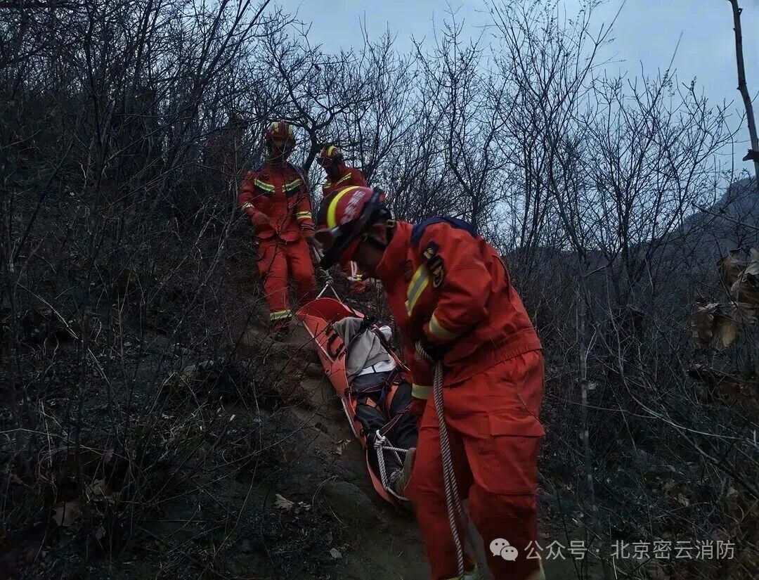 14时59分,溪翁庄消防救援站接警后,立即出动6名消防员。为抢回黄金救治时间,消防人员联合民警、120医护人员,在当地向导带领下,携带救援装备徒步疾行,手脚并用匍匐攀爬,争分夺秒奔赴被困点。沿途路段山势陡峭险峻,多处坡度逼近80度。野长城墙体残破不堪,毫无安全防护,每一步前行都险象环生。