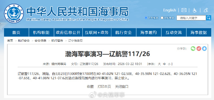 据中国海事局网站消息,锦州海事局发布航行警告,3月23日13时至17时,渤海部分海域进行军事演习,禁止驶入。