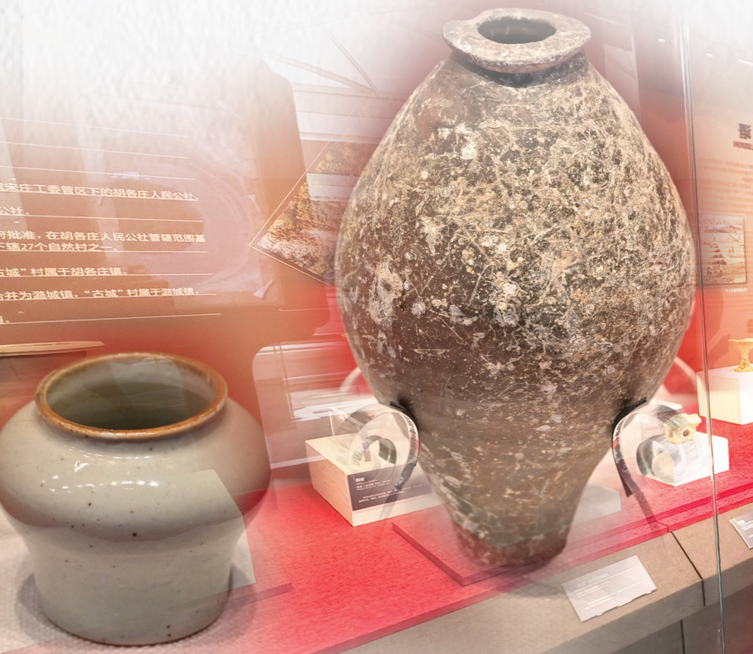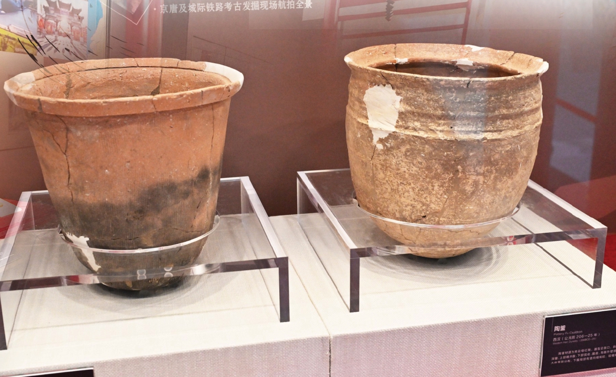 “快来看,这个文物上面还有铭文。”参观者小小惊呼将记者吸引到西汉时期的“大吉”戳印文器底前。这是一件残损的圆形陶制器底,中间阳刻有隶书“大吉”二字。一旁还摆放着诸多与日常生活息息相关的文物,比如一对大小相当的陶釜。两件文物均为侈口,筒状深腹,腹壁斜直,器物外壁装饰有竖向细绳纹。陶釜是汉代最核心的炊煮工具,通常与灶具配套使用,用于煮食肉类、稻谷等。两件陶釜的出土表明西汉时期路县故城居民的饮食生活较为成熟,“釜灶结合”的烹饪方式是当时家庭饮食的典型特征。