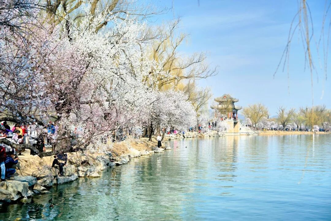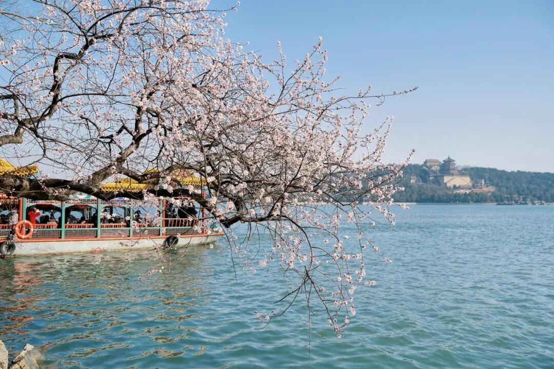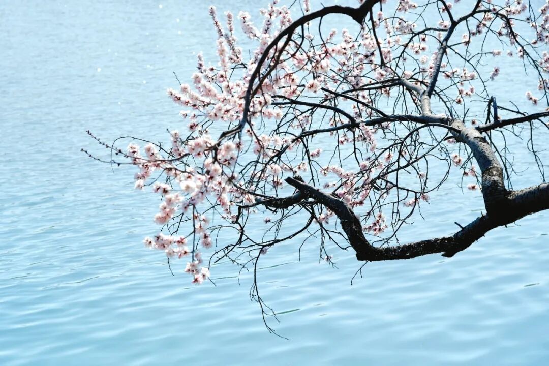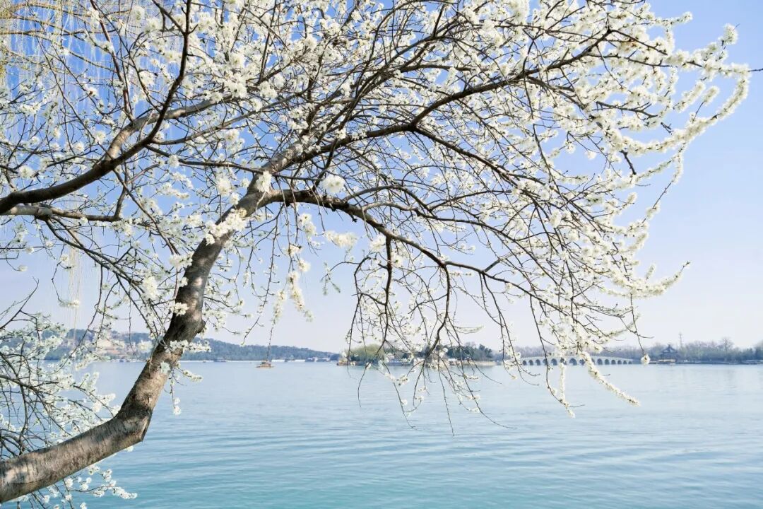 烂漫的粉白与湖水的湛蓝、古建的青灰