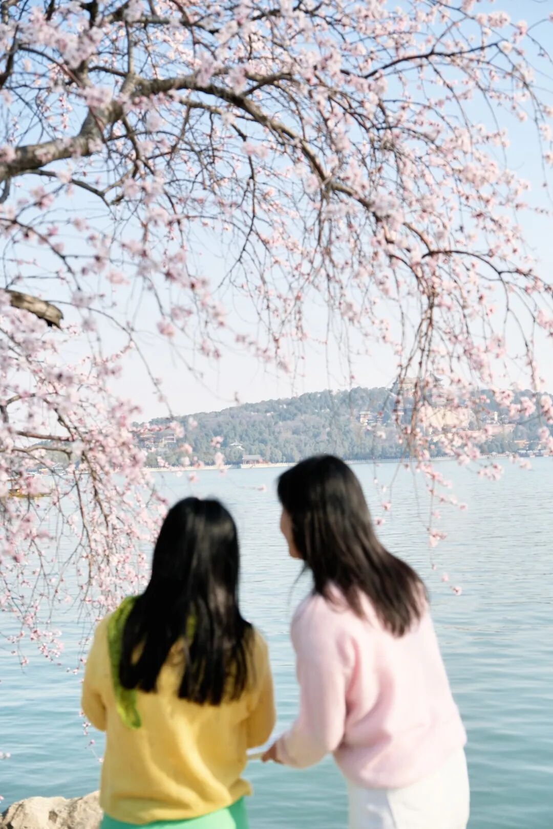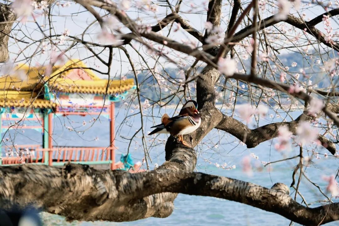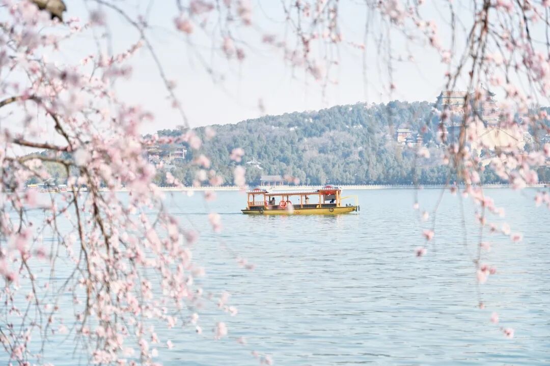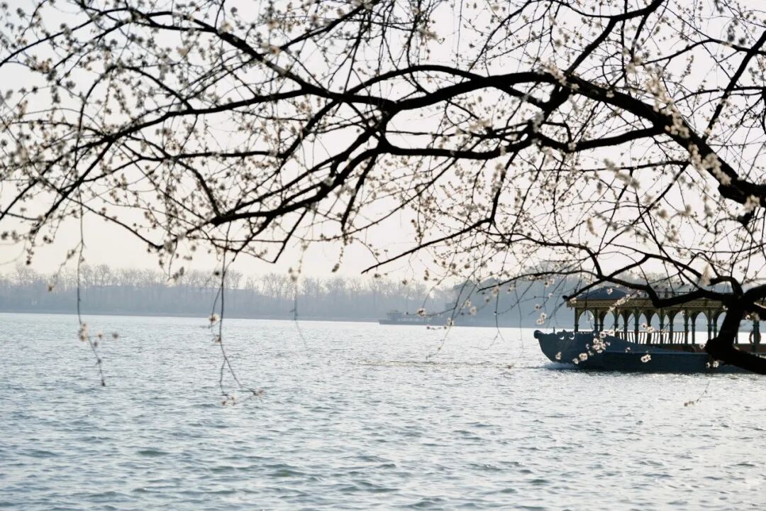 烂漫的粉白与湖水的湛蓝、古建的青灰