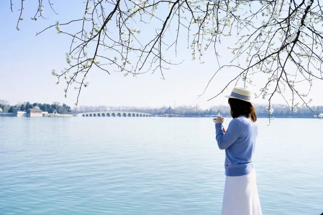 镜桥,这里是公认的“最佳观赏点”之一。桥畔山桃最为繁盛,以桥为前景,以佛香阁为背景,是拍摄颐和园春景的“标准”打卡地。