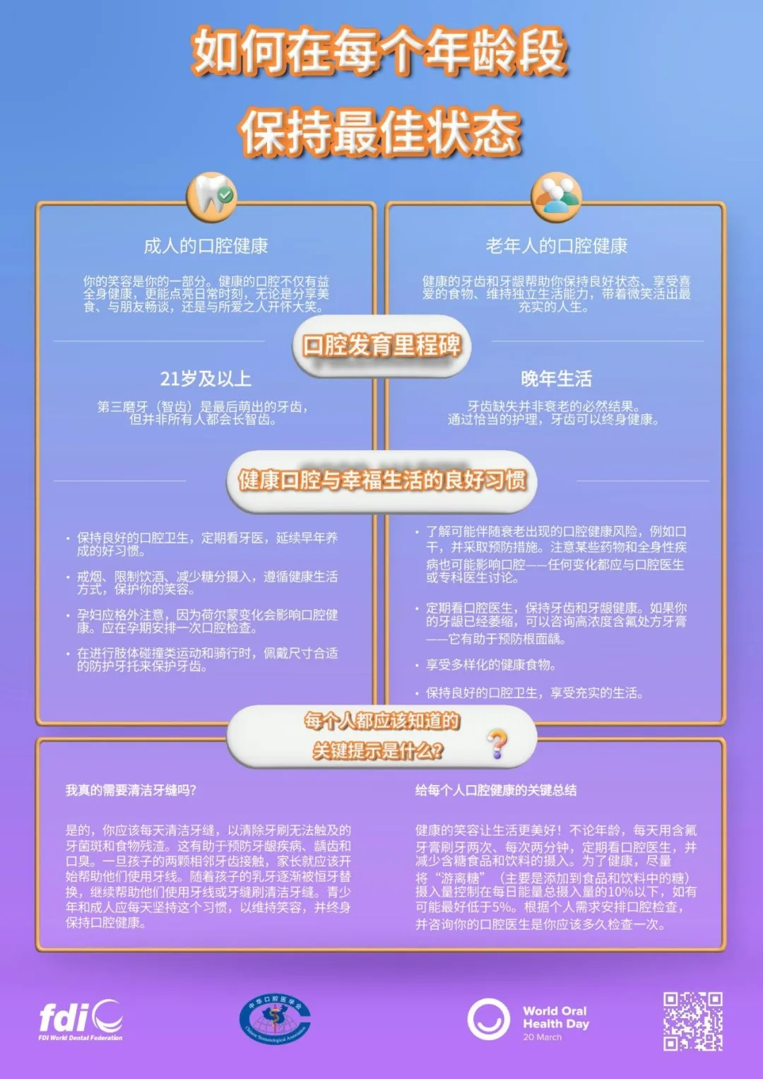 不管哪个年纪,每天刷两次牙、用牙线、牙间隙刷清洁牙缝、远离含糖食物、定期口腔检查,都是守护口腔的黄金法则。