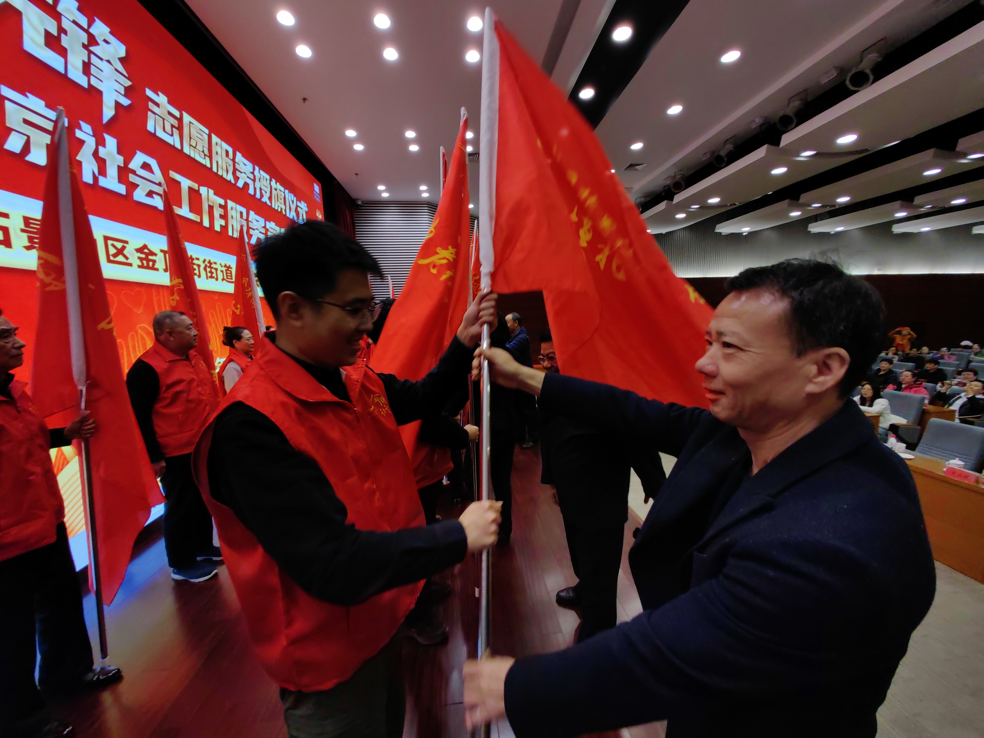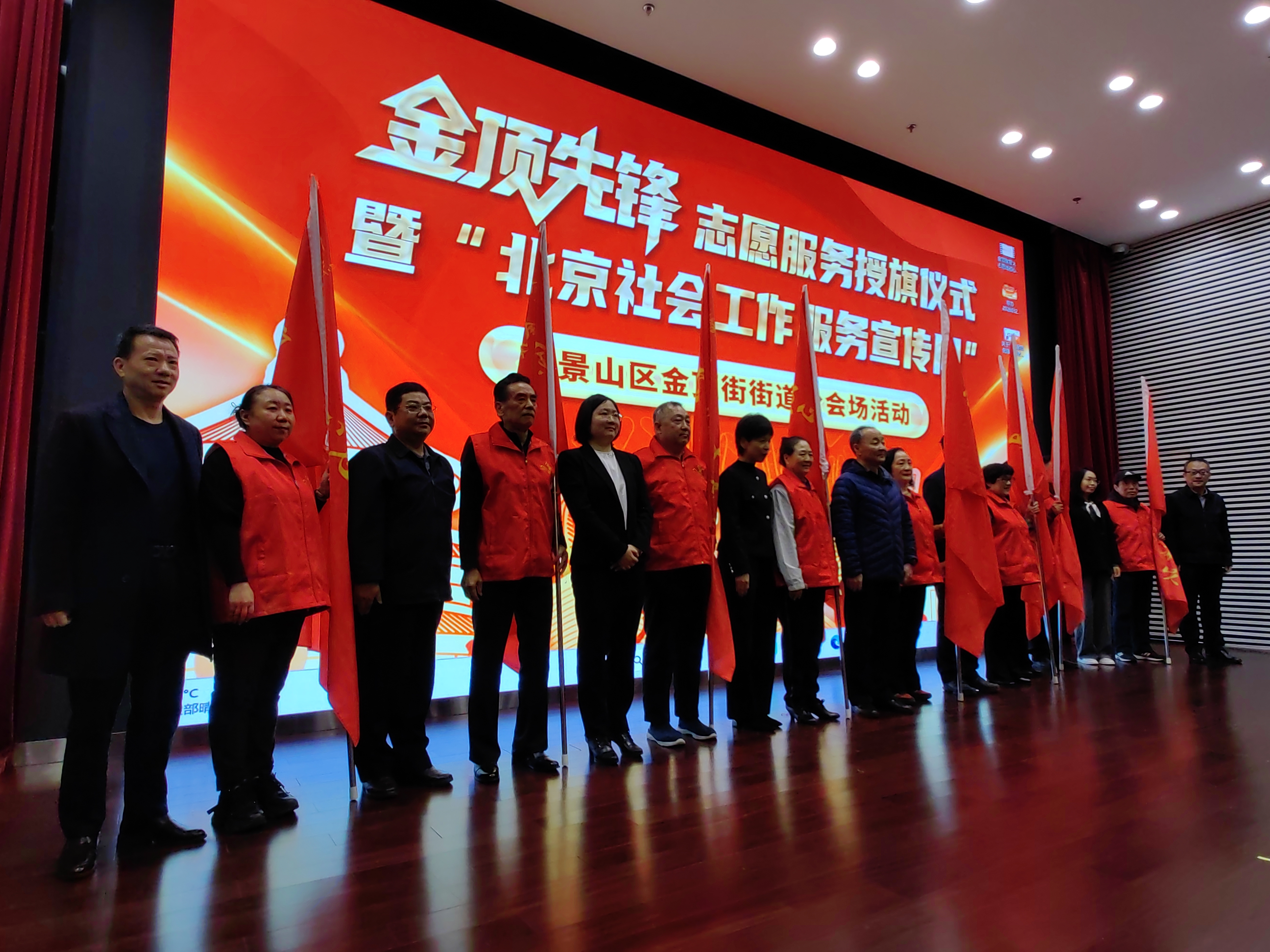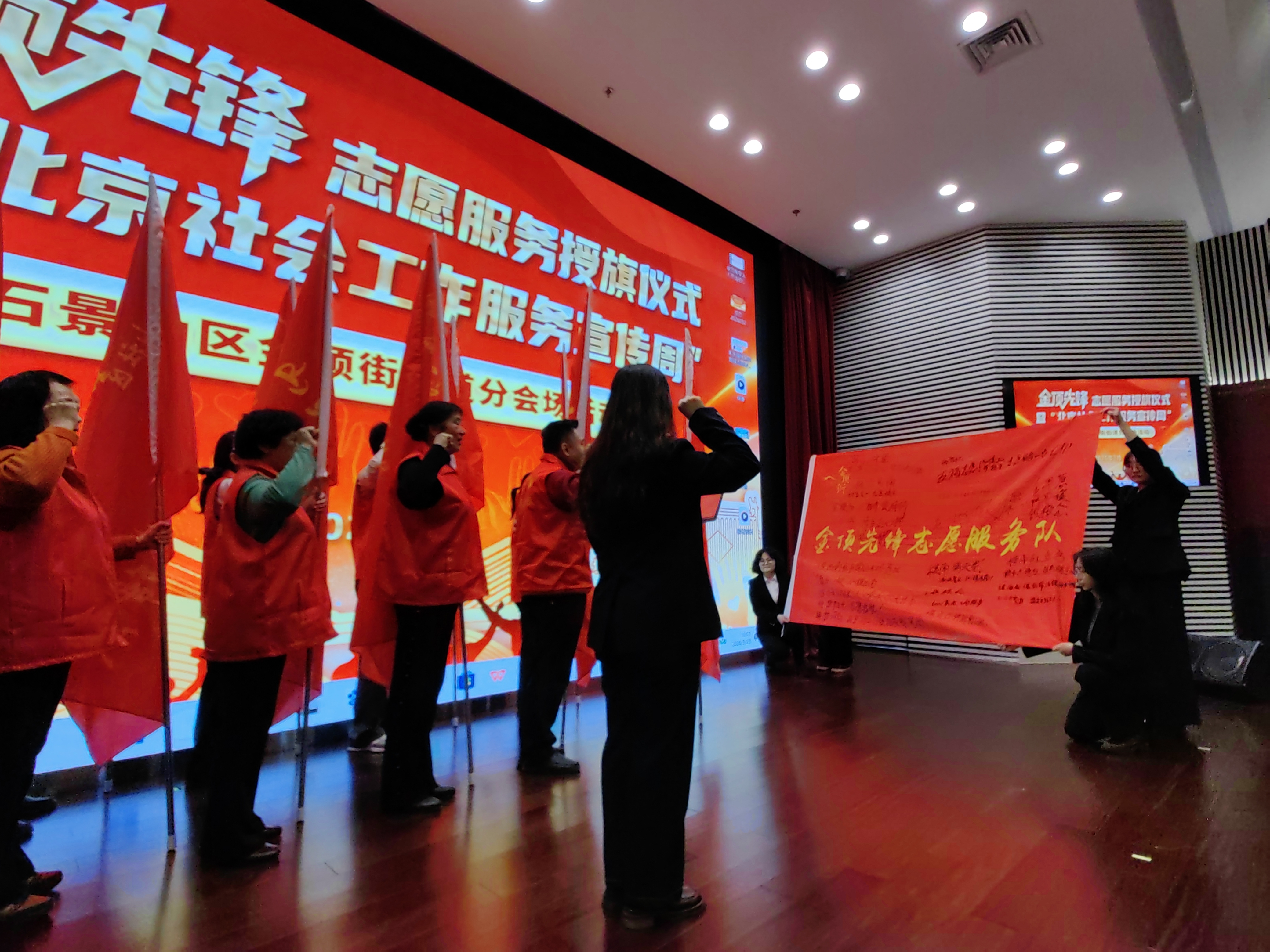3月23日,石景山区金顶街街道举办授旗仪式,17支金顶先锋志愿服务队将服务社区居民。