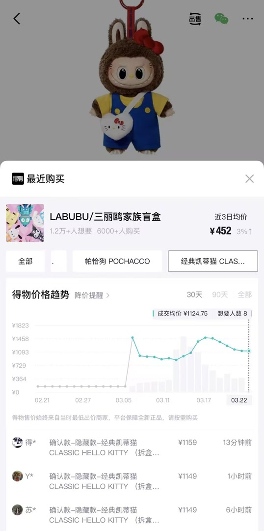 “LABUBU三丽鸥美乐蒂,平出(注:即原价出)”“LABUBU三丽鸥帕恰狗,亏本出145元”“LABUBU凯蒂猫中娃,原价出不包邮”……LABUBU联名三丽鸥上新以来,记者所在的潮玩玩家交流群里,陆续有人原价甚至亏本出产品。