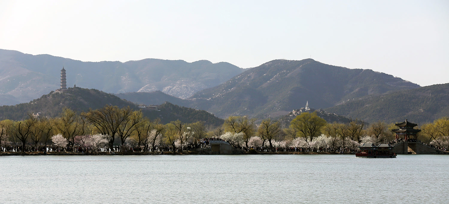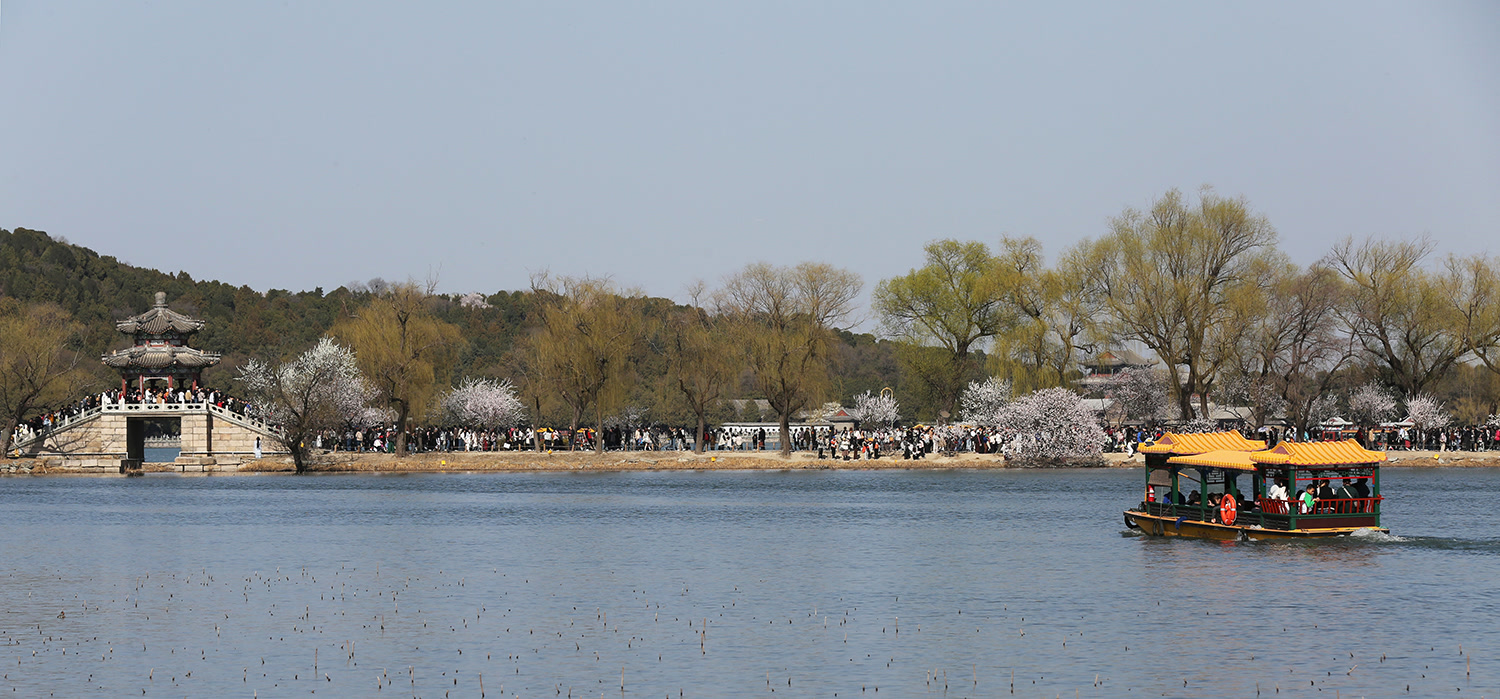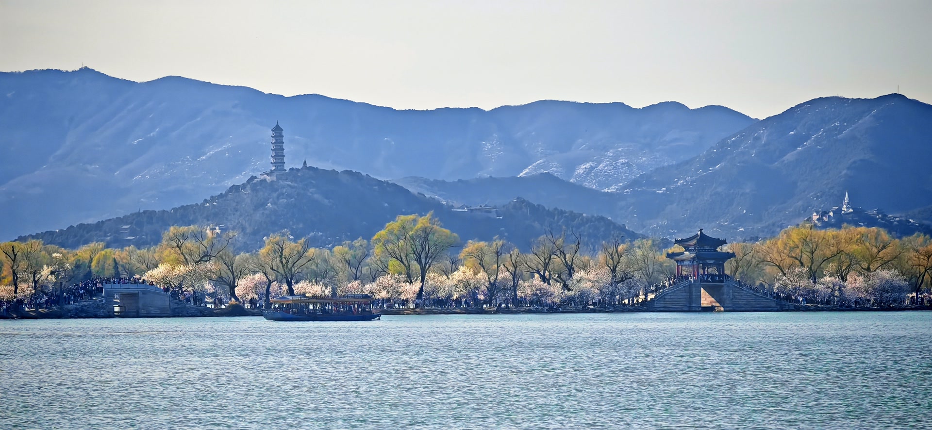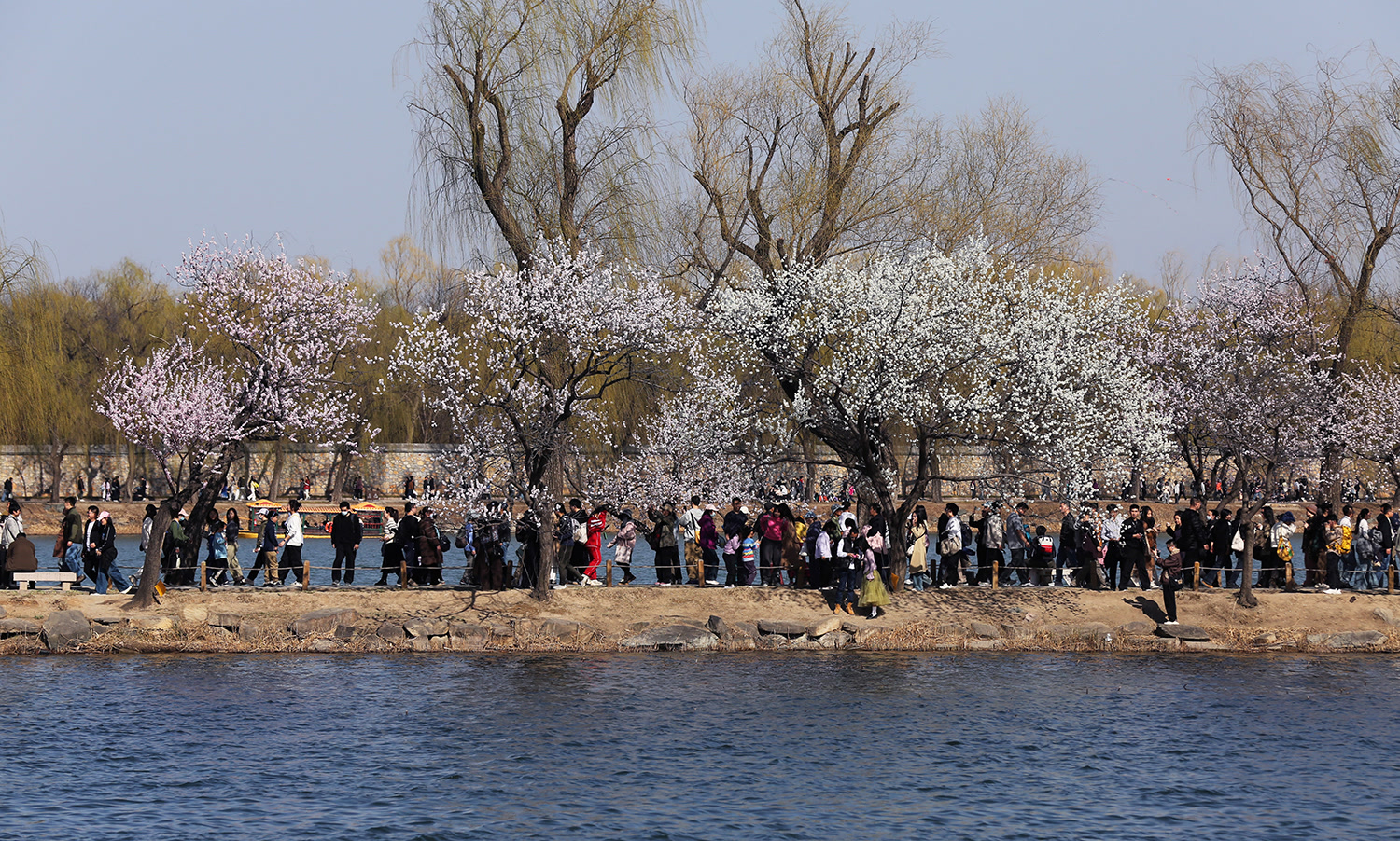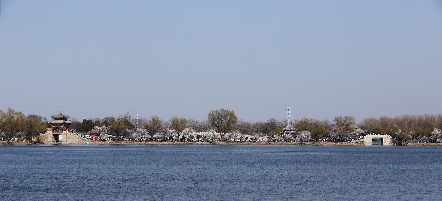 西堤,仿杭州西湖苏堤而建。明媚春光下,西堤少了些烟雨朦胧的江南婉约,却多了几分北方山水的大气与明丽。人在堤上行,如在画中游,隔着一池昆明碧水遥望,那片绯云仿佛是浮在水面上的梦境,又像一幅幅徐徐展开的春日长卷。