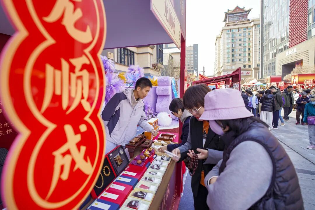 历经多轮优化升级,如今“隆福潮集”已拥有62个特色摊位,汇聚非遗技艺、老字号美食、驻京办风味、潮流文创等多元内容,周末日均客流突破10万人次,工作日客流超5万人次,春节以来商街整体销售额突破1500万元。