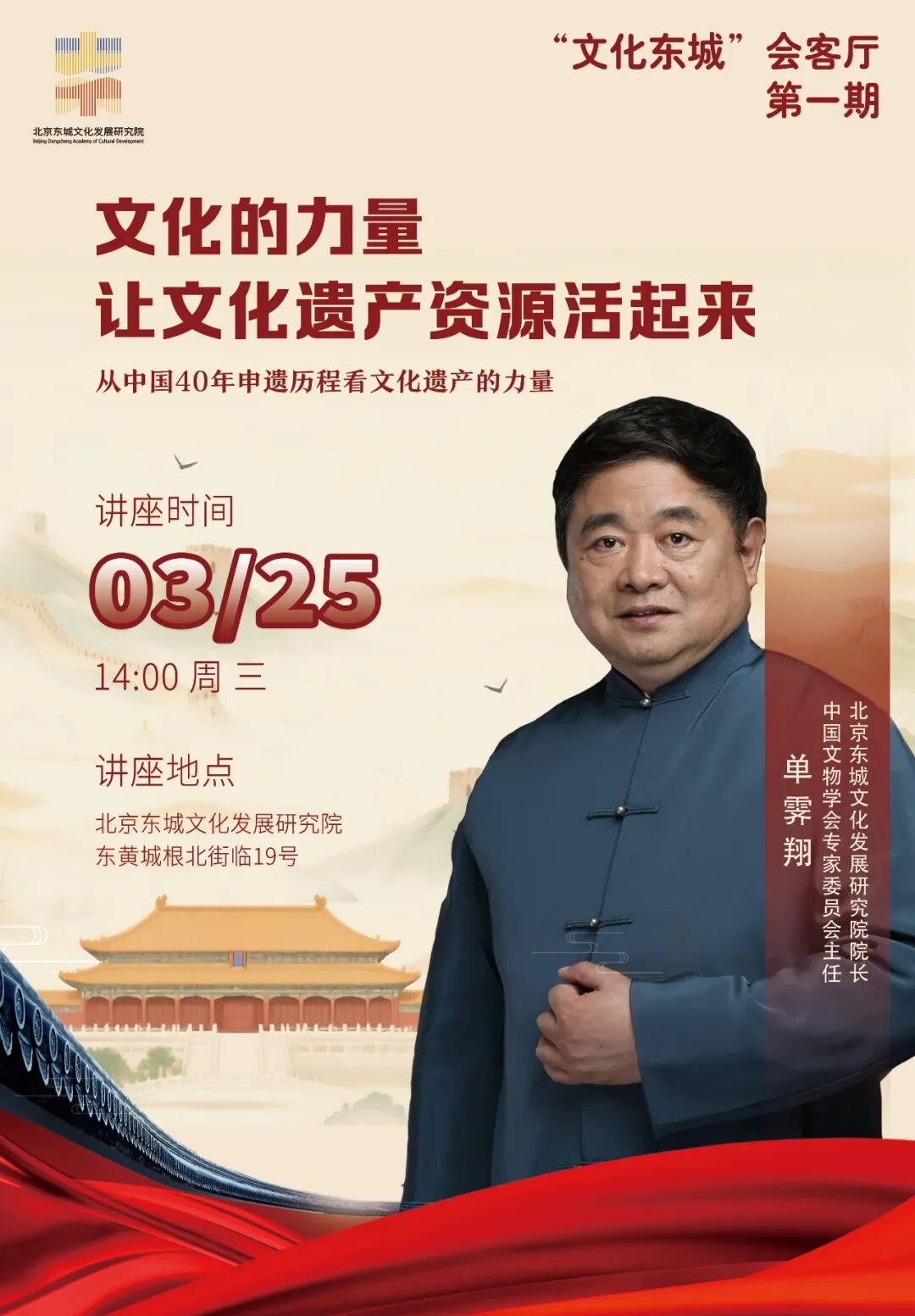 为探寻文化遗产保护活化与城市更新协同发展的实践路径,推动历史文化和现代生活有机融合,2026年“文化东城”会客厅第一期将以“文化的力量,让文化遗产资源活起来”为主题,邀请中国文物学会专家委员会主任、故宫博物院第六任院长、北京东城文化发展研究院院长单霁翔担任主讲嘉宾,回顾中国加入《世界遗产公约》40年来的探索历程,剖析东城区文化遗产系统性保护的实践经验,为城市高质量发展注入深厚的文化动力。