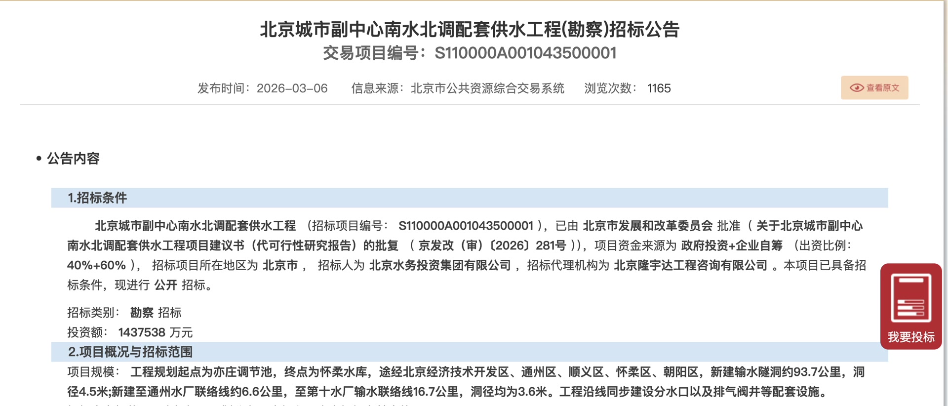 记者从北京市公共资源综合交易系统网站了解到,近日,北京城市副中心南水北调配套供水工程(勘察)招标公告已发布。该招标公告表明,该工程规划起点为亦庄调节池,终点为怀柔水库,途经北京经济技术开发区、通州区、顺义区、怀柔区、朝阳区等5区,新建输水隧洞约93.7公里,洞径4.5米,工程沿线同步建设分水口以及排气阀井等配套设施,项目总估算投资超143.75亿元,工程规模大、覆盖范围广。
