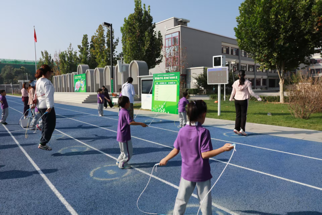 曾经让孩子们分批次绕楼跑操的操场,如今变身超1万平方米的智能综合运动场,8条标准赛道,各类球类场地一应俱全,AI智能识别系统、阳光跑、智慧跳绳等智能设备的加入,让课间运动趣味满满,孩子们在跑跑跳跳中放松身心,更在互动中学会合作与守规则,校园真正成了孩子们“撒欢儿”成长的乐园。