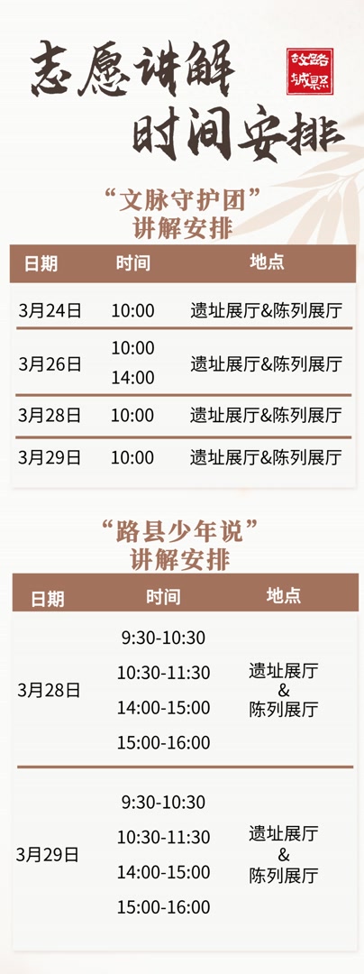 路县故城遗址公园致力于为市民游客朋友们打造沉浸式的历史文化体验,博物馆各展厅均设有讲解服务。除了每日4场公益讲解以及AI自助讲解之外,为了让大家更深入了解路县故城的历史,我们特别设立了志愿讲解服务(具体讲解安排详见下表)。