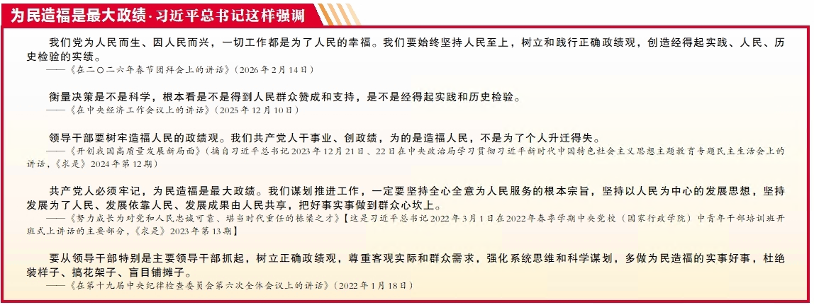 纪检监察机关要牢固树立造福人民的政绩观,坚持人民至上的立场。要深入推进群众身边不正之风和腐败问题集中整治,聚焦农村集体“三资”管理、医保基金管理、养老服务等领域,坚决惩治基层“微腐败”,坚决纠治吃拿卡要、优亲厚友等问题,持续增强群众的获得感、幸福感、安全感。持续纠治形式主义、官僚主义突出问题,引导广大党员干部力戒虚功、祛除浮躁,多办惠民生、解民忧、利长远的好事实事。始终把群众拥护不拥护、赞成不赞成、高兴不高兴、答应不答应作为检验工作成效的根本标准,持之以恒正风肃纪反腐,切实把为民造福的政绩观落到守护群众切身利益的实际行动中。(云南省陆良县委常委,县纪委书记、监委主任 阮吉焕)