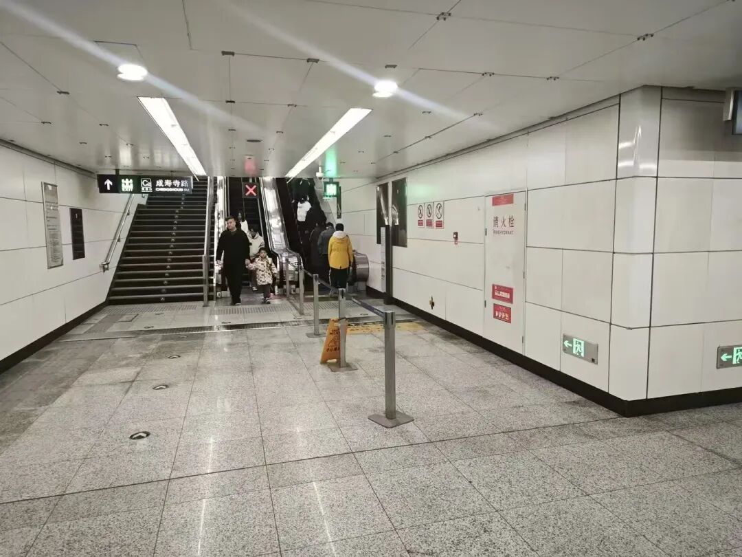 市民反映:近日,北京地铁10号线成寿寺站西南口,存在应急物资和可疑物品占用盲道的情况。