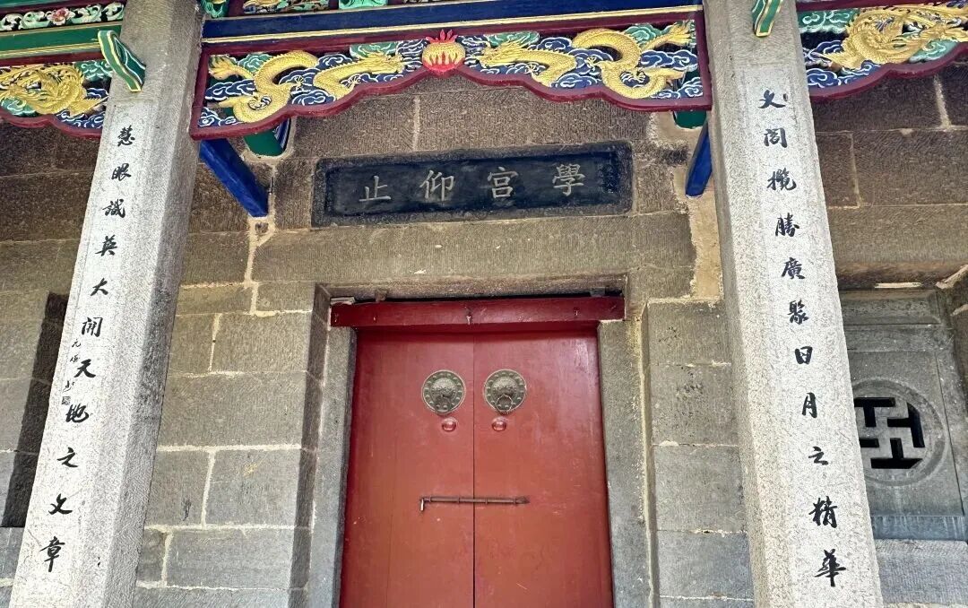 “学宫仰止”四个大字高悬檐下,笔触苍劲,站在文昌阁上眺望,可看到古村的秀丽多姿。