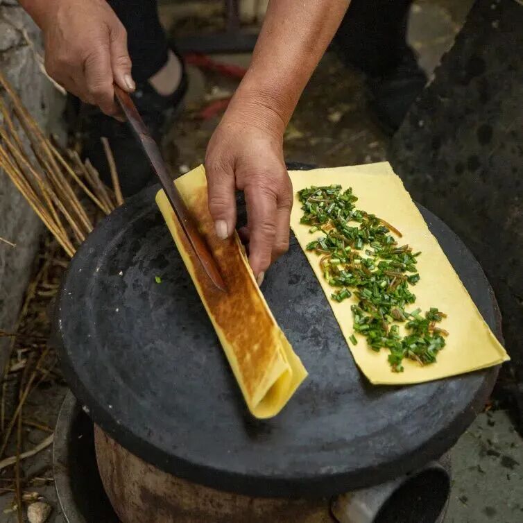 筋道十足的章丘手工煎饼薄如宣纸,卷上大葱和咸菜,就是最朴实的美味。