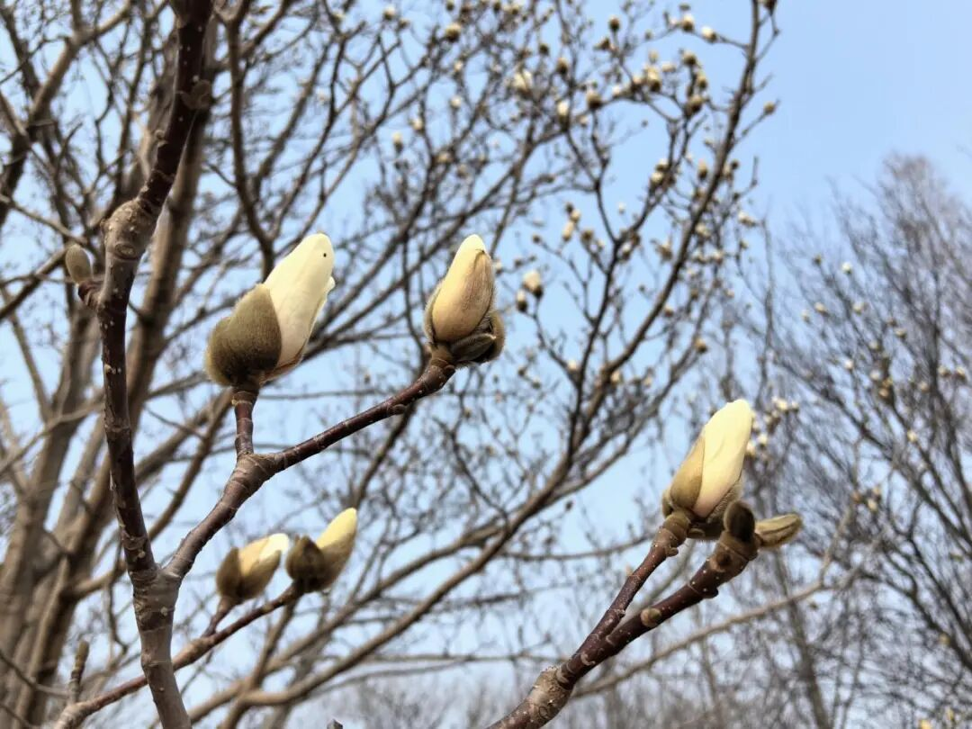 行走在木兰园里,白玉兰、紫玉兰的花苞裹着毛茸茸的外衣,像攥紧的小拳头,悄悄在枝头蓄力,有的已裂开细纹,透出内里如玉的花瓣。