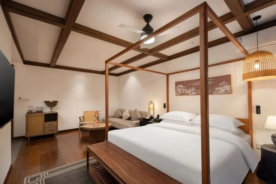 客栈内部装饰陈设很别致,竹木材质的家具别有韵味,推窗就能看到水景,非常有“小桥流水人家”的意境。