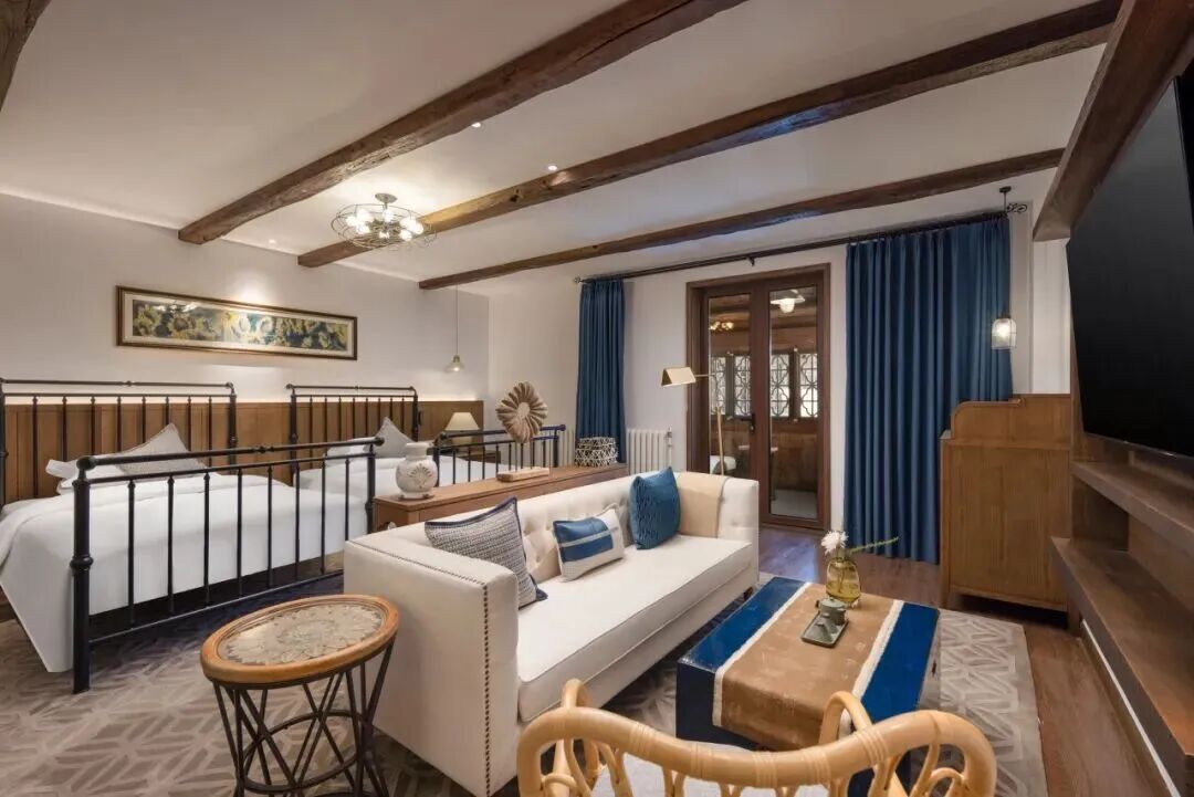 客栈临水而建,紧邻万盛炉冶坊与府前街,出门即可跨入绵延的烟火小街,房间多为套房设计,空间比较大,很适合家庭出游。