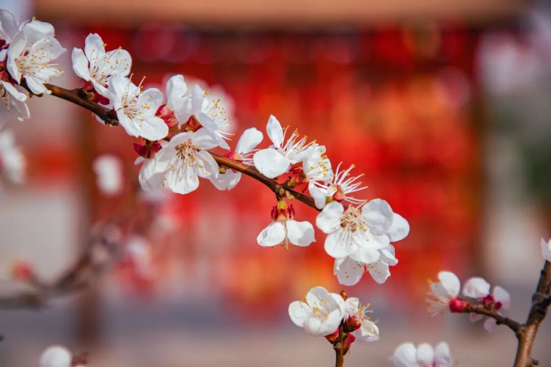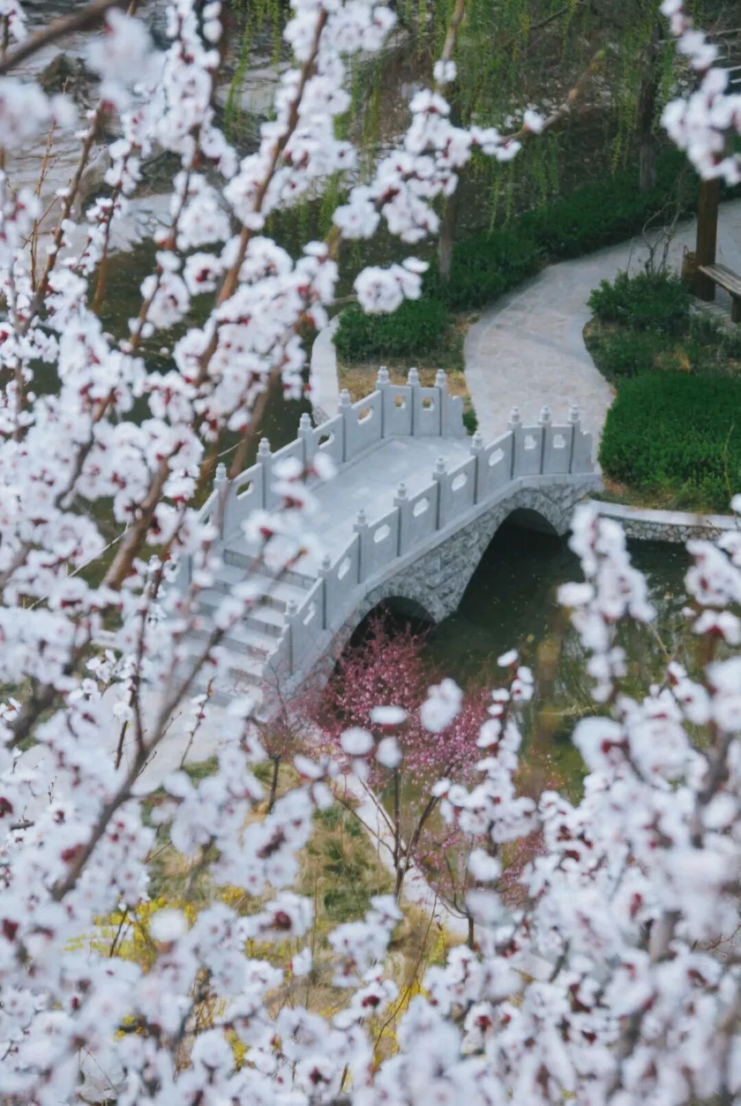 粉白的杏花点缀在圣境的亭台楼阁间,将人文景观与自然美景完美融合,是赏杏、感受传统文化的绝佳之地。
