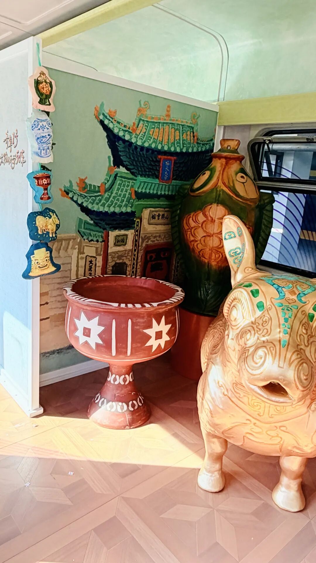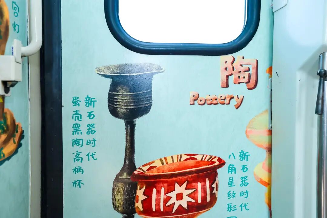 硬座车厢之一的主题为陶。山东作为大汶口文化、龙山文化等史前文明的遗址所在地之一,出土了不少珍贵的陶器,如今它们也登上列车,为我们展示着千年前的社会风貌。