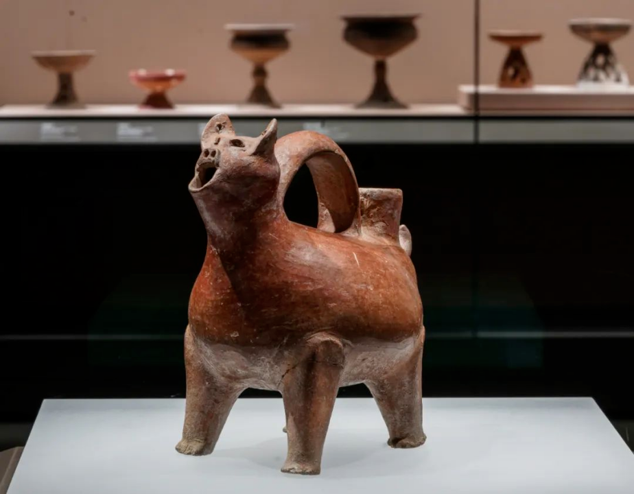 山东博物馆藏红陶兽形壶,是源自新石器时代大汶口文化的酒器,通体磨光,遍施红色陶衣,圆面耸耳,光润亮泽,整体像近似猪或狗形。