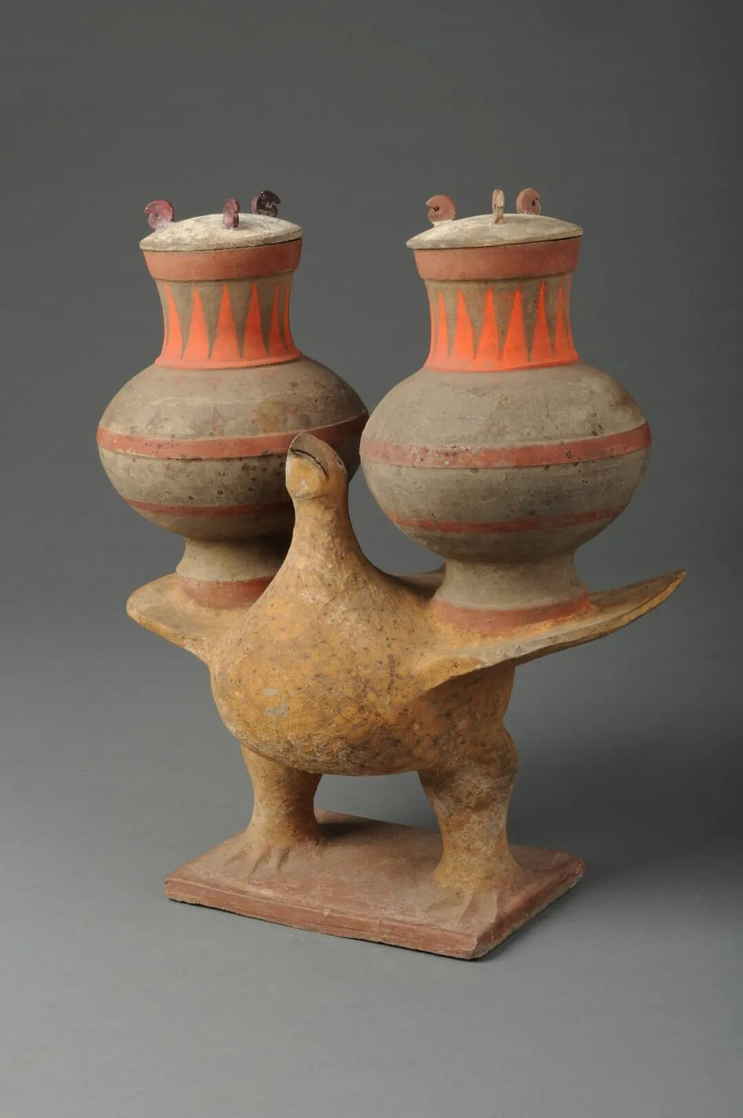 西汉·彩绘负壶陶鸟
