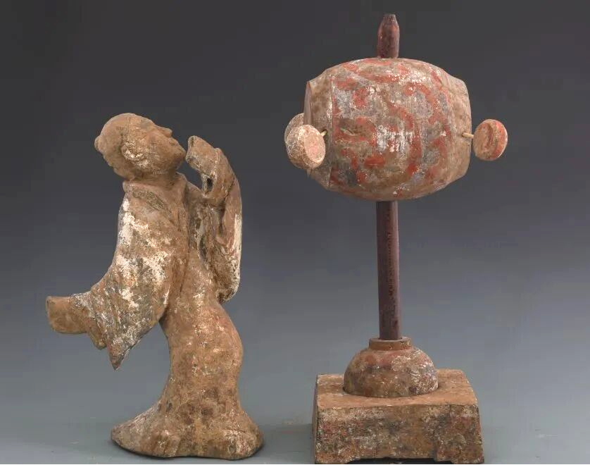 西汉彩绘陶击鼓俑距今2100年,高41厘米。一根长杆贯穿鼓身,方形底座,鼓面上画着云纹,两旁配有小鼓,称为应鼓或和鼓。用于应和节拍,丰富音色。