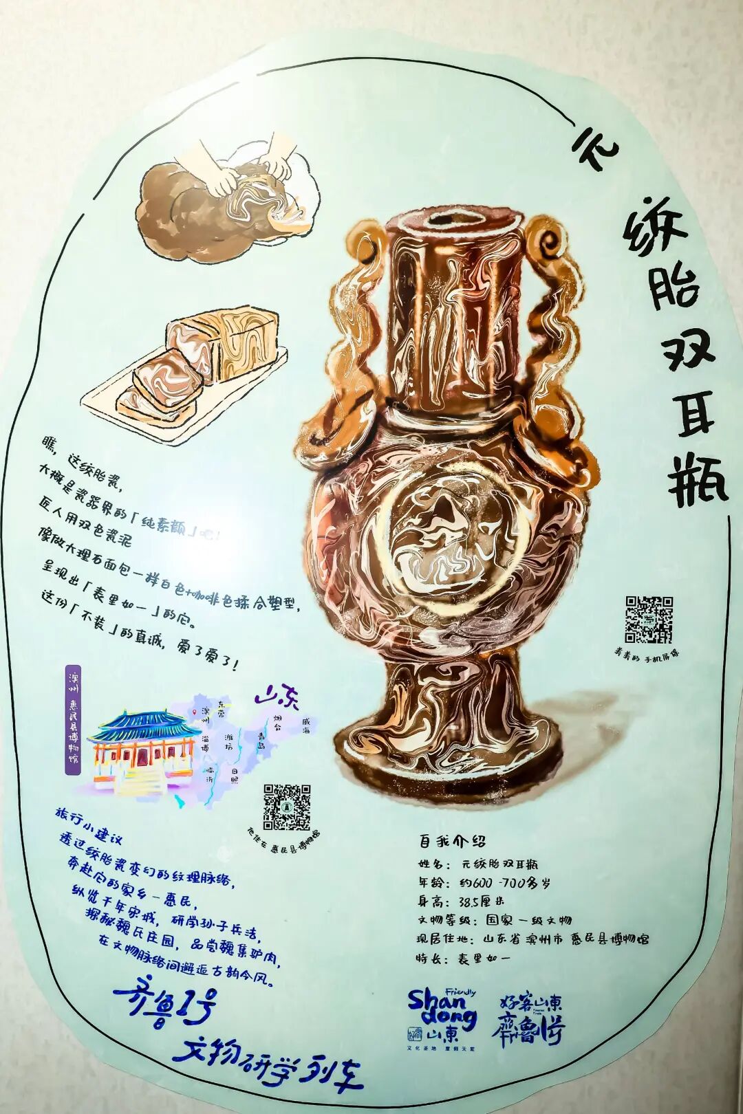 元绞胎双耳瓶是惠民县博物馆镇馆之宝,这件器物以白褐胎泥绞揉成形,纹理行云流水、古朴典雅,是元代北方陶瓷工艺的杰出代表。