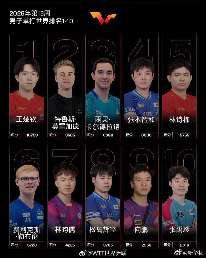 男子单打,中国队球员王楚钦位列第一,林诗栋位列第五,向鹏位列第九。