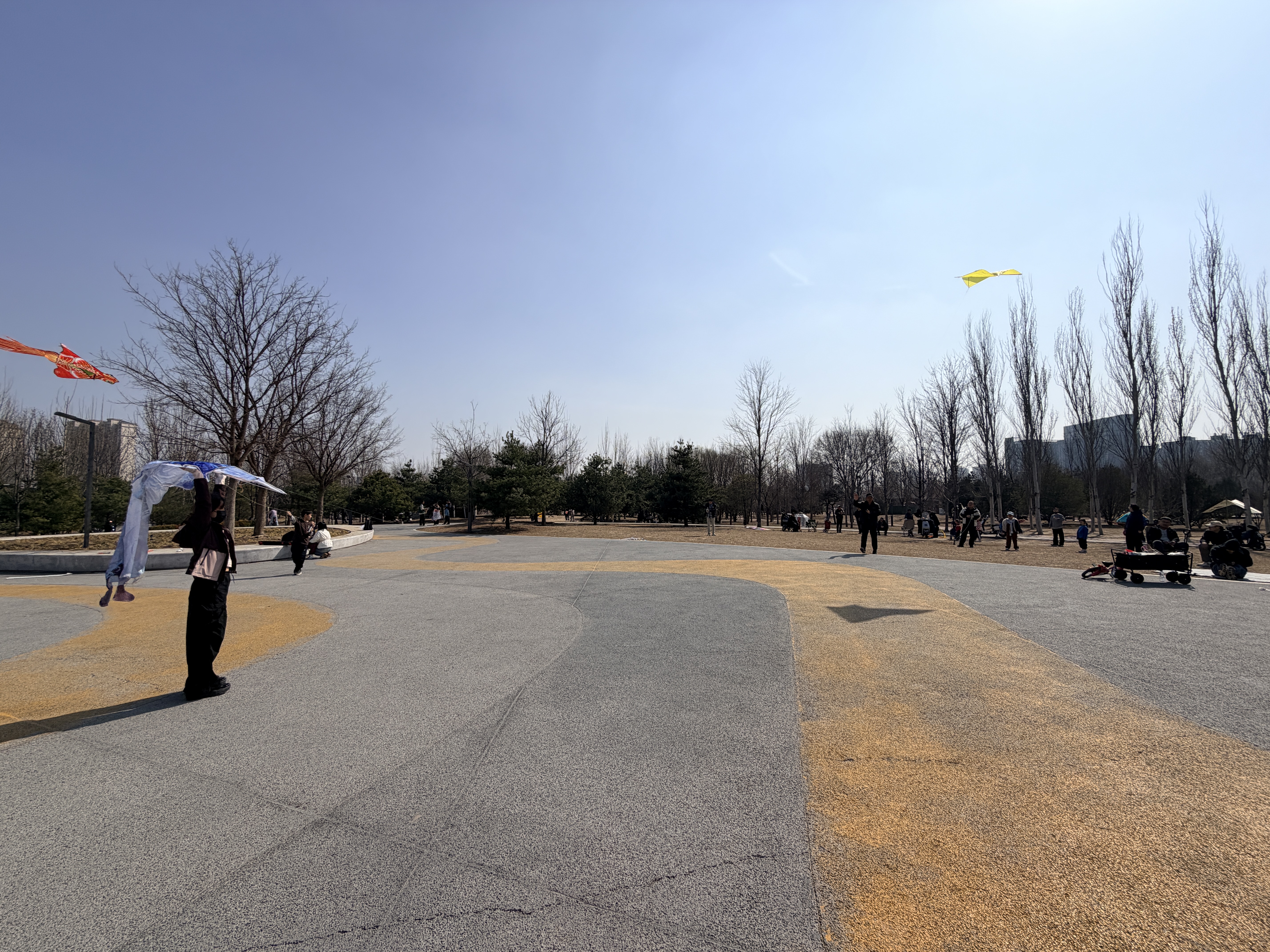 在公园的小广场区域,不少市民在此放风筝,由于场地有限、风力不大,风筝大多没能飞上高空,只是在低空来回穿梭、盘旋,有的甚至横穿整个小广场,细长的风筝线紧绷着,如同一条条隐形的“刀口”。而这个小广场是游人休闲的集中区域,不少未成年人在奔跑玩耍,还有人骑着车在周围穿梭,人员往来密集。紧绷的风筝线几乎与未成年人的身高持平,一旦有人奔跑时不小心撞上,或是车轮被风筝线缠到,极易受伤、绊倒。现场多位家长对此表示担忧,一位家长说:“这些放风筝的人只顾着自己开心,根本不顾及别人的安全。”