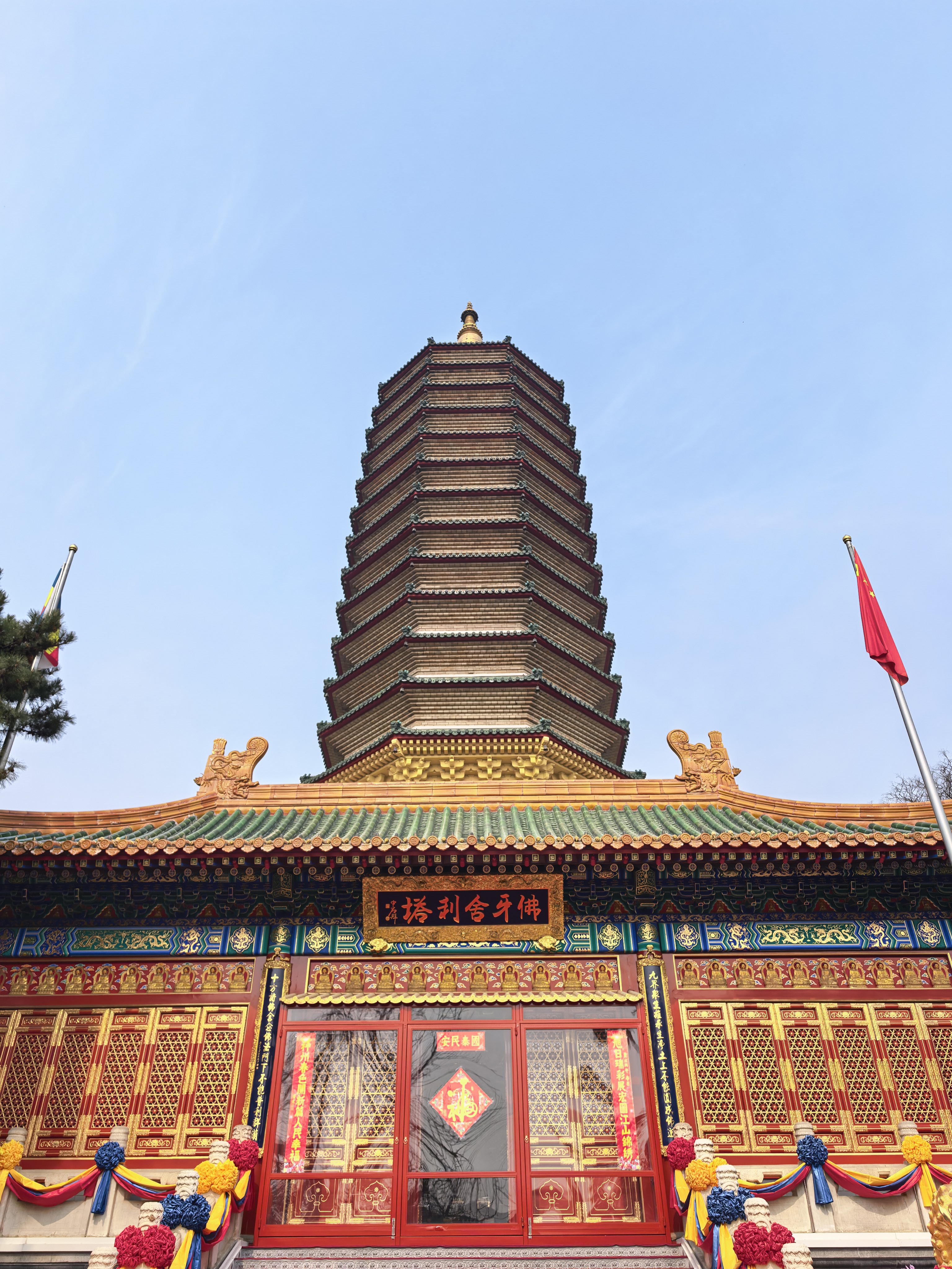 拍完之后,我在塔前的石阶上坐下来,细细端详。塔身八角形,每层都有飞檐翘角,檐下挂着铜铃,风过时便发出清脆的声响。塔基用汉白玉砌成,上面雕刻着莲花与经文。整座塔造型简洁庄重,没有过多的雕饰,却自有一种摄人心魄的力量。