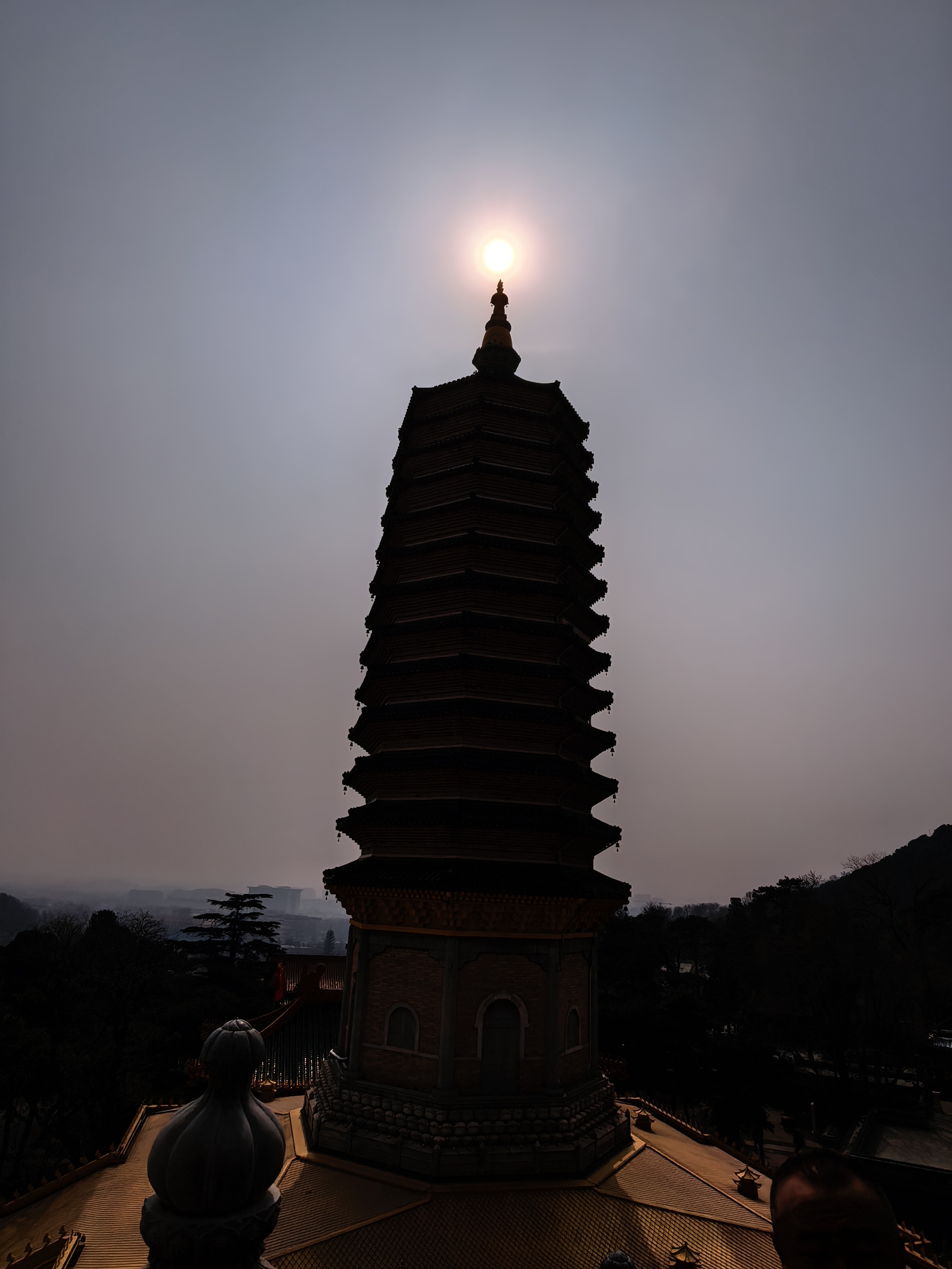 转过一个弯,塔尖便从树梢后露了出来。春日的阳光正好打在塔身的上半部分,绿色的琉璃瓦泛着温润的光,金色的塔刹在蓝天下格外醒目。等我走到塔前的平台上,才真正被这景象震撼——太阳恰好移到了塔顶的正上方,从这个角度看过去,塔尖仿佛顶着一轮金色的光轮,光芒从塔刹周围放射开来,整座塔都被笼罩在一层柔和而庄严的光晕里。春分过后,太阳的轨迹渐渐北移,恰在这一刻与塔尖形成了奇妙的呼应,仿佛是天地间一场无声的对话。