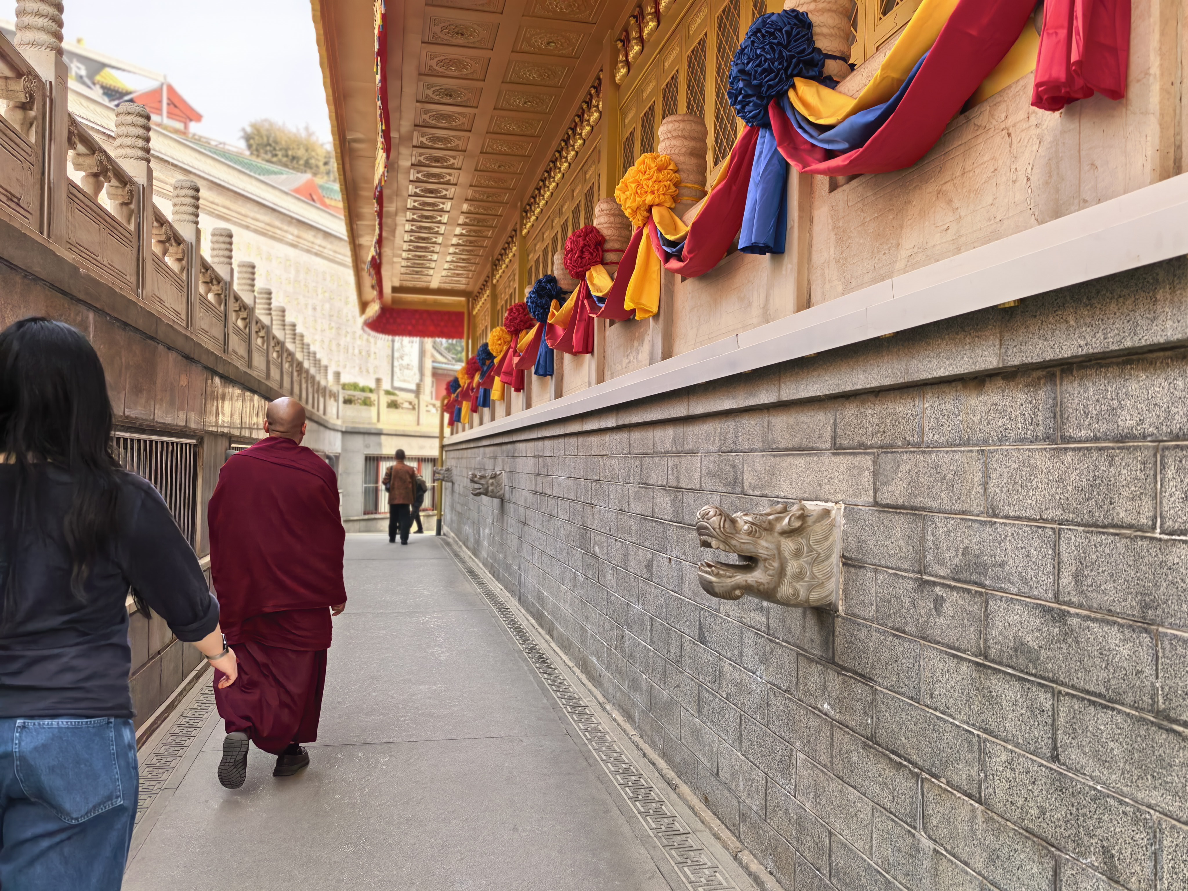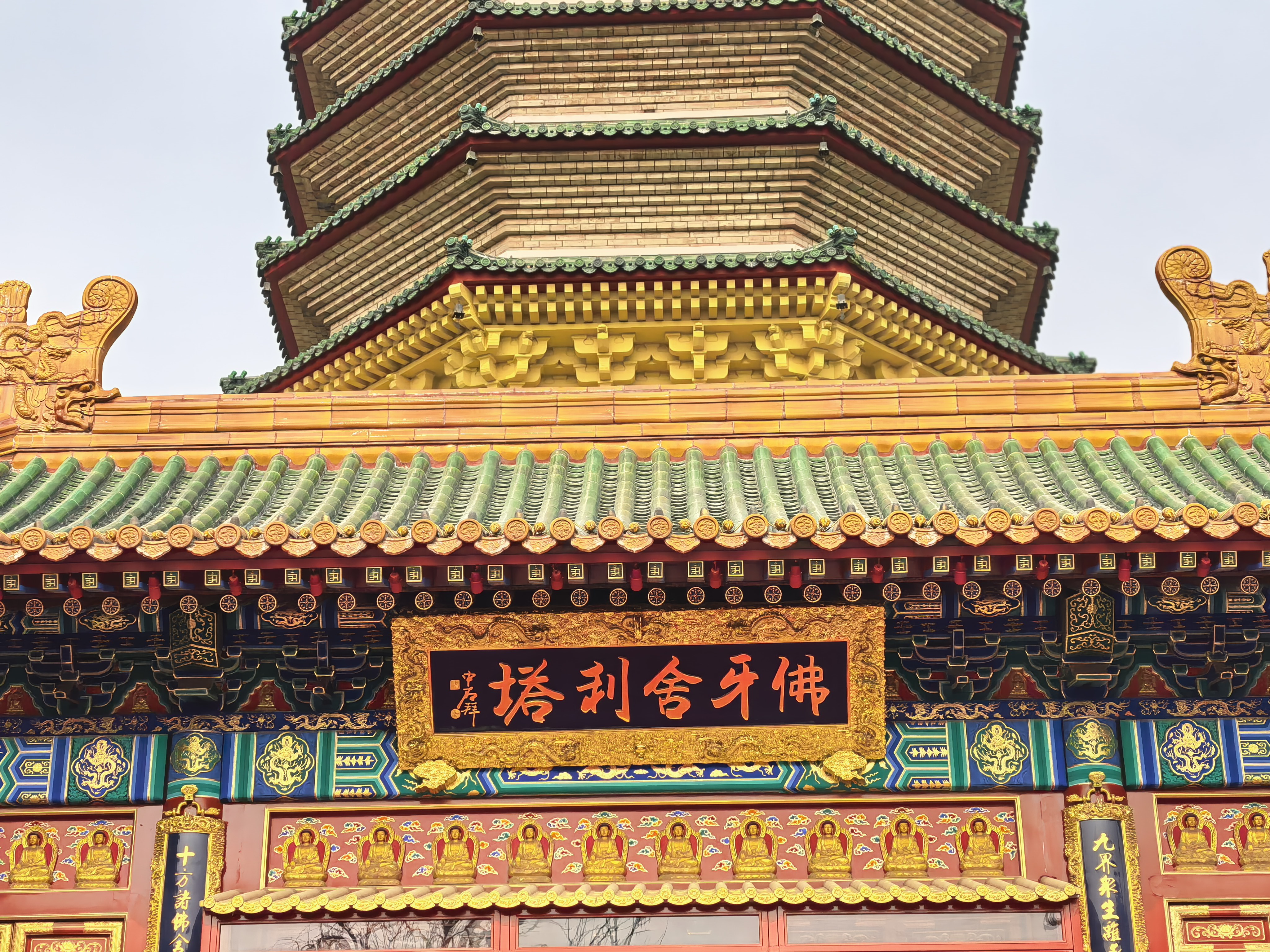 关于这座塔,我是知道一些的。塔里供奉的佛牙舍利,据说是释迦牟尼涅槃后留存在世间的两颗真身灵牙之一,另一颗在斯里兰卡。这颗佛牙辗转流离,辽代咸雍七年(1071年)被供奉于灵光寺的招仙塔中,一供就是八百多年。可惜的是,招仙塔在一九〇〇年毁于八国联军的炮火,所幸佛牙安然无恙——寺僧在清理瓦砾时发现了石函,函中有沉香木匣,匣上题记写着“释迦佛灵牙舍利”,这才让圣物重见天日。后来在周恩来总理的过问与批准下,于原塔之北择地重建新塔,一九六四年夏落成开光,佛牙终于有了永久的安奉之所。