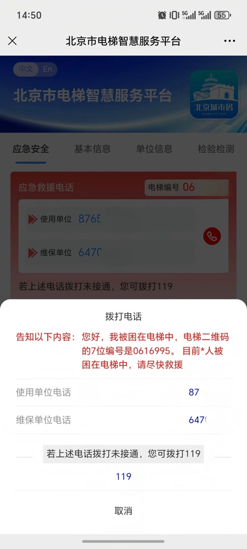 距宋家庄地铁站约一公里,金颐家园小区有五栋高层居民楼。该小区的多个单元楼门的电梯外部,未看到张贴有电梯二维码。扫描电梯内部的二维码,很快弹出使用单位和维保单位的联系方式。记者模拟遭遇被困,拨打首页第一栏“应急救援电话”中的使用单位电话,才发现二维码上登记的电话号码为空号,无法打通。两次拨打维保单位的电话,一时间也无法接通。后续连续拨打终于接通,一名维保人员对报上的小区名字略显生疏,表示“可能叫法不一样”,并询问了是否被困和位置情况。