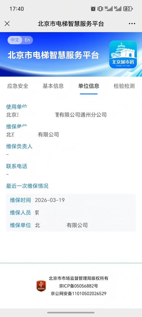 扫描小区26号楼四个单元楼门的电梯二维码,显示维保信息齐全、正常。扫描27号楼1单元的电梯二维码,页面跳转后发现,首页使用单位信息为空白,第三栏的维保负责人和联系方式为空白;3单元、5单元电梯间的二维码,扫描跳转后缺失维保负责人和联系方式。这一情况最为普遍的,属28号楼。扫描小区28号楼1单元的二维码,跳转后首页第一栏和第三栏,缺失维保负责人和电话信息,2单元、3单元、4单元、7单元扫描情况一致。